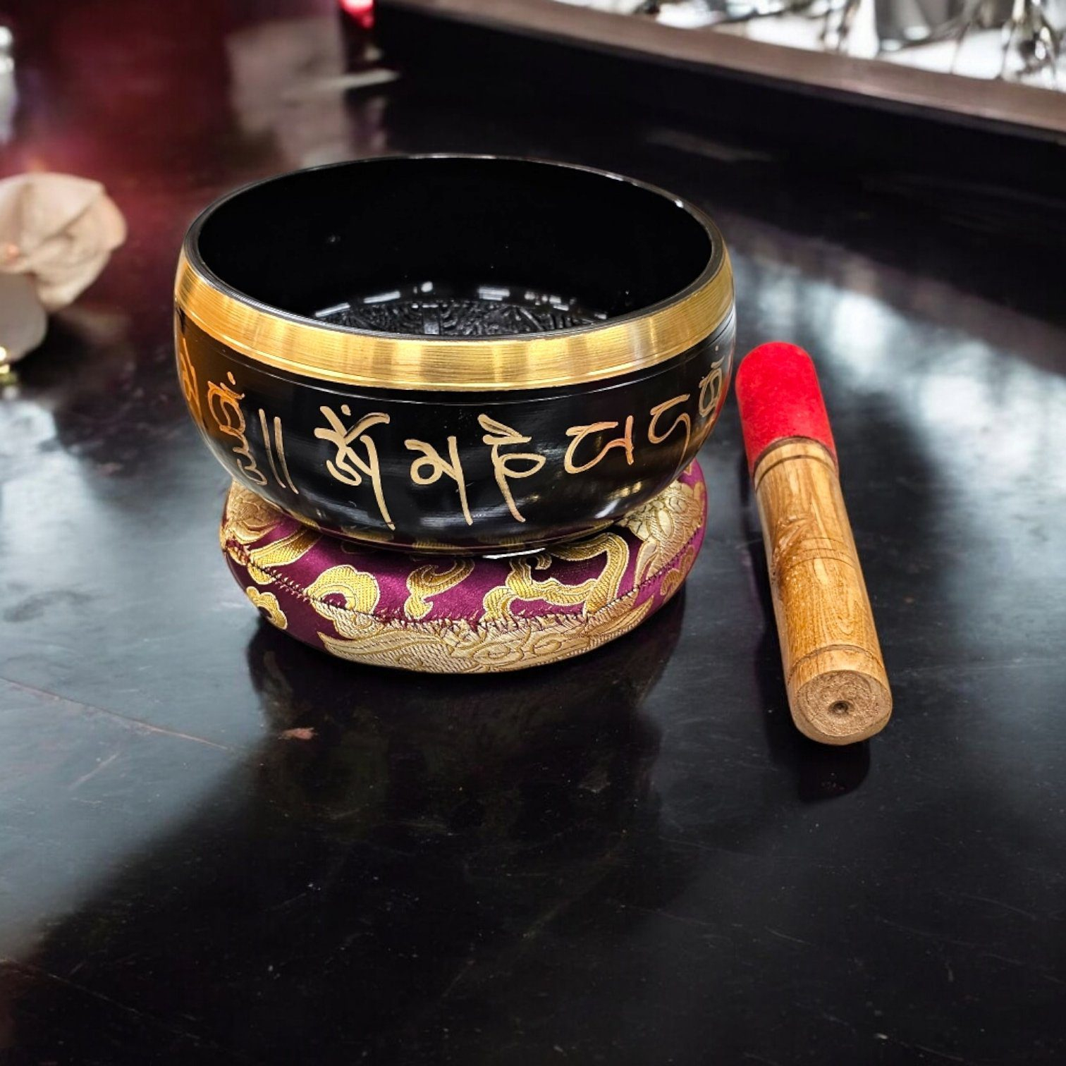 Buy this beautiful 6-inch Brass Singing Bowl Set with Ganesha and Om Mani Padme Hum mantra. Complete set also includes the brocade cushion and wooden suede striker. Perfect for meditation, yoga, sound therapy and healing.