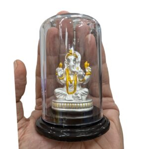 The silver idol, crafted with intricate detailing, is 2 inches tall and sits gracefully within the protective dome, which measures 3.3 inches in height. The transparent acrylic ensures a crystal-clear view while safeguarding the idol from dust and damage, preserving its brilliance for years to come.