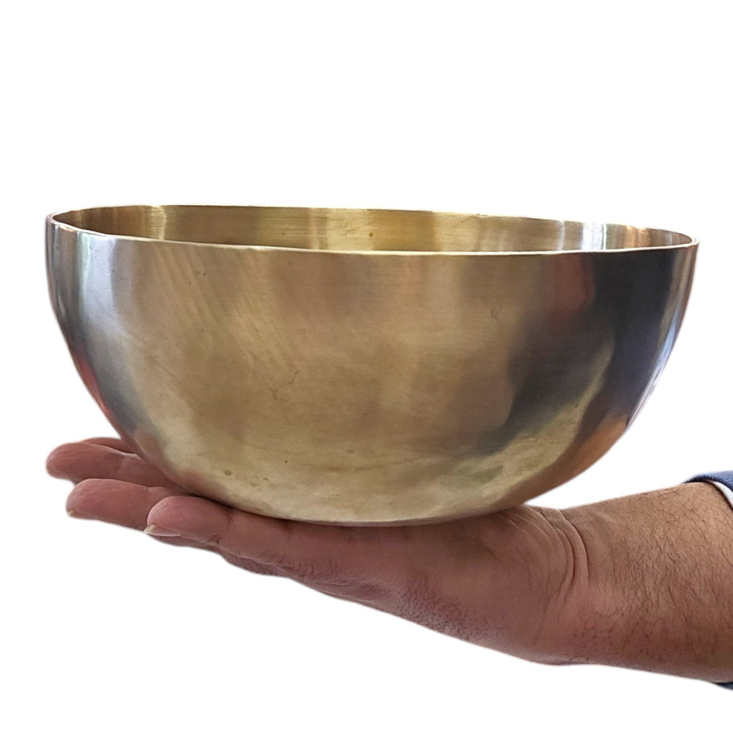 Experience the serene and harmonious tones of this 9-inch handmade singing bowl, crafted with precision by skilled artisans in India. This stunning bowl, weighing 1250 grams, is made from high-quality alloy of brass and bronze, ensuring durability and rich sound resonance.