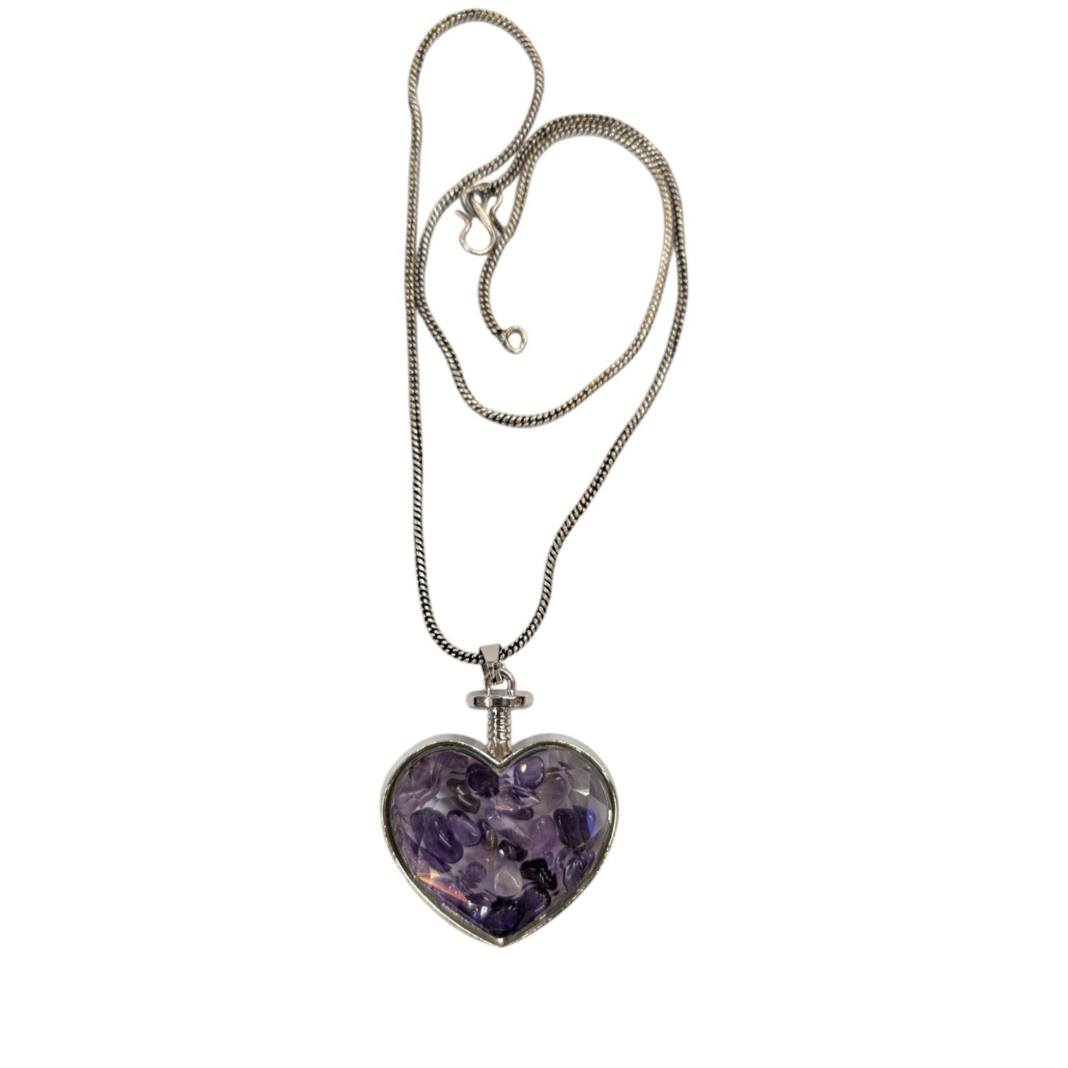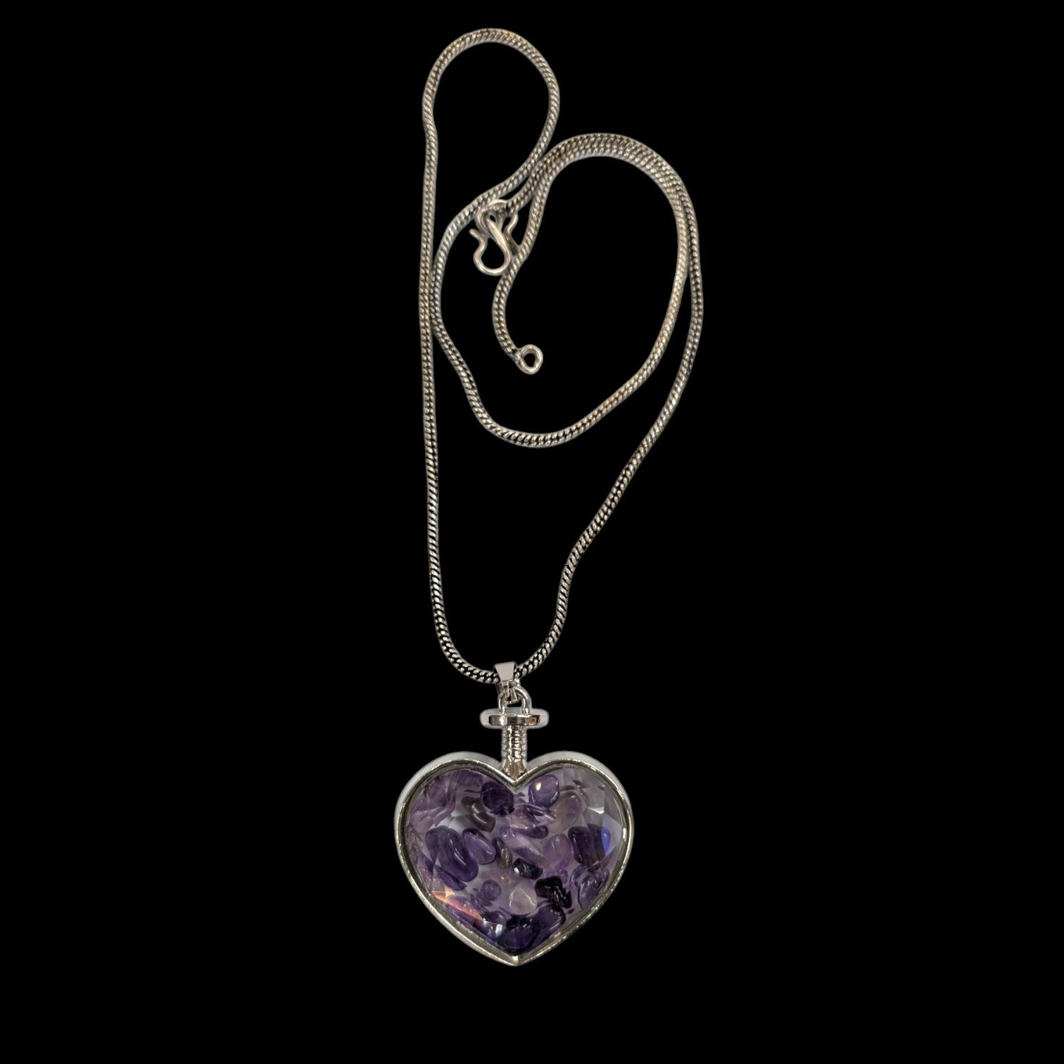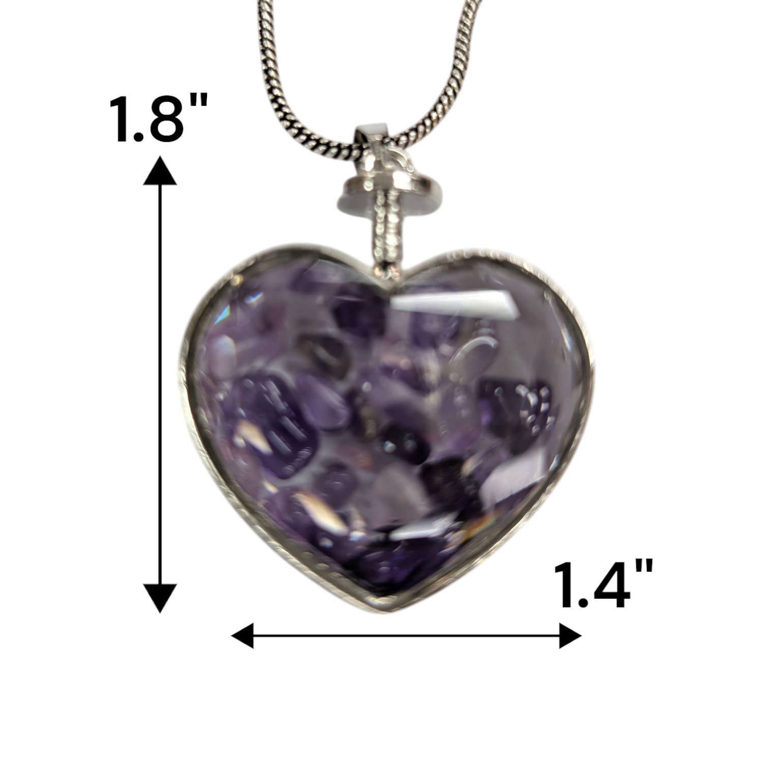 - Premium Materials: The heart-shaped pendant is crafted from high-quality glass and filled with irregularly sized natural Amethyst gemstones for a unique touch.