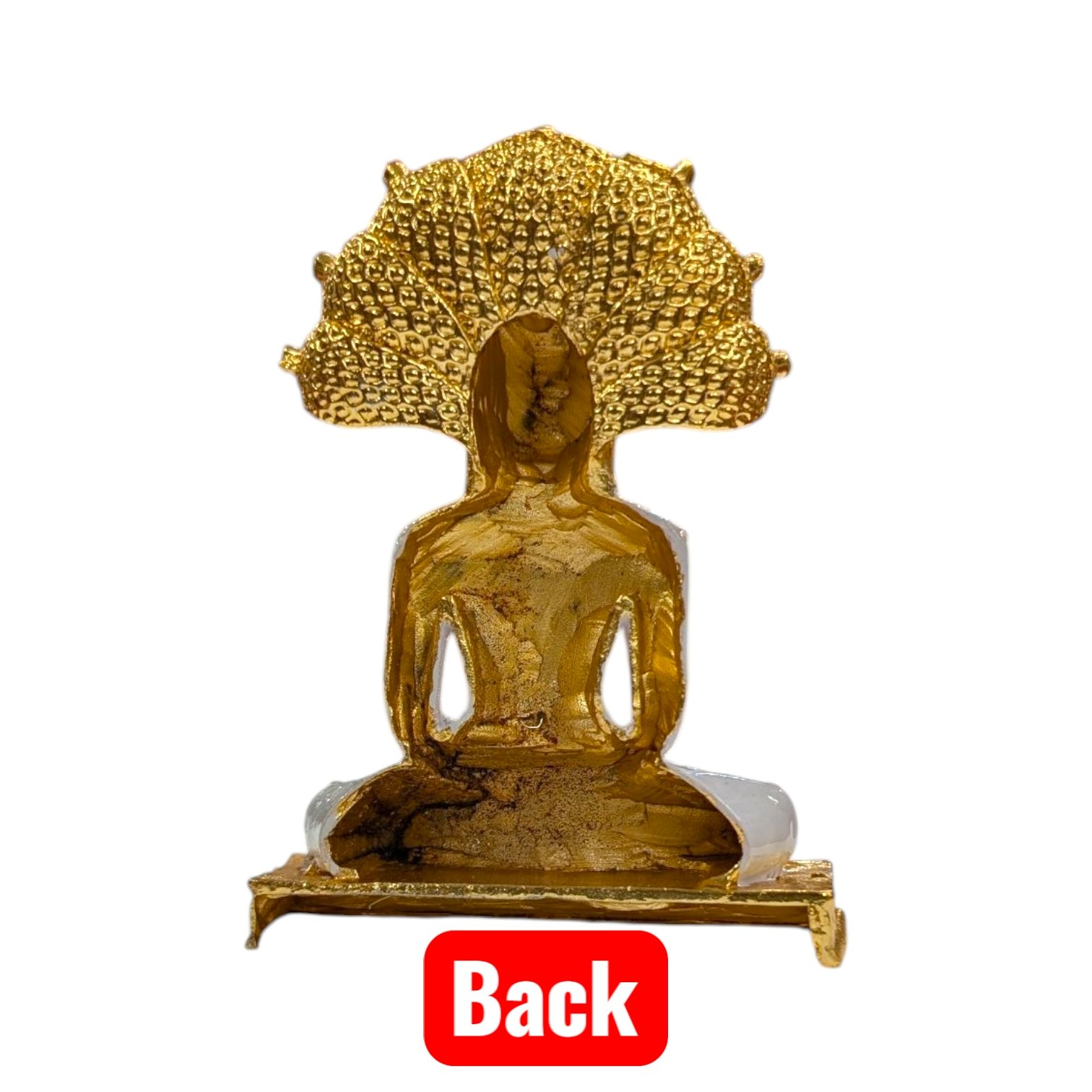 Featuring attractive handmade details that capture the serene and compassionate likeness of Bhagwan Parshvanath with exquisite precision. The idol is adorned with a striking multi-hooded serpent (Sheshnaag) studded with brilliant Cubic Zirconia (CZ), symbolizing protection and adding a dazzling spiritual focus.