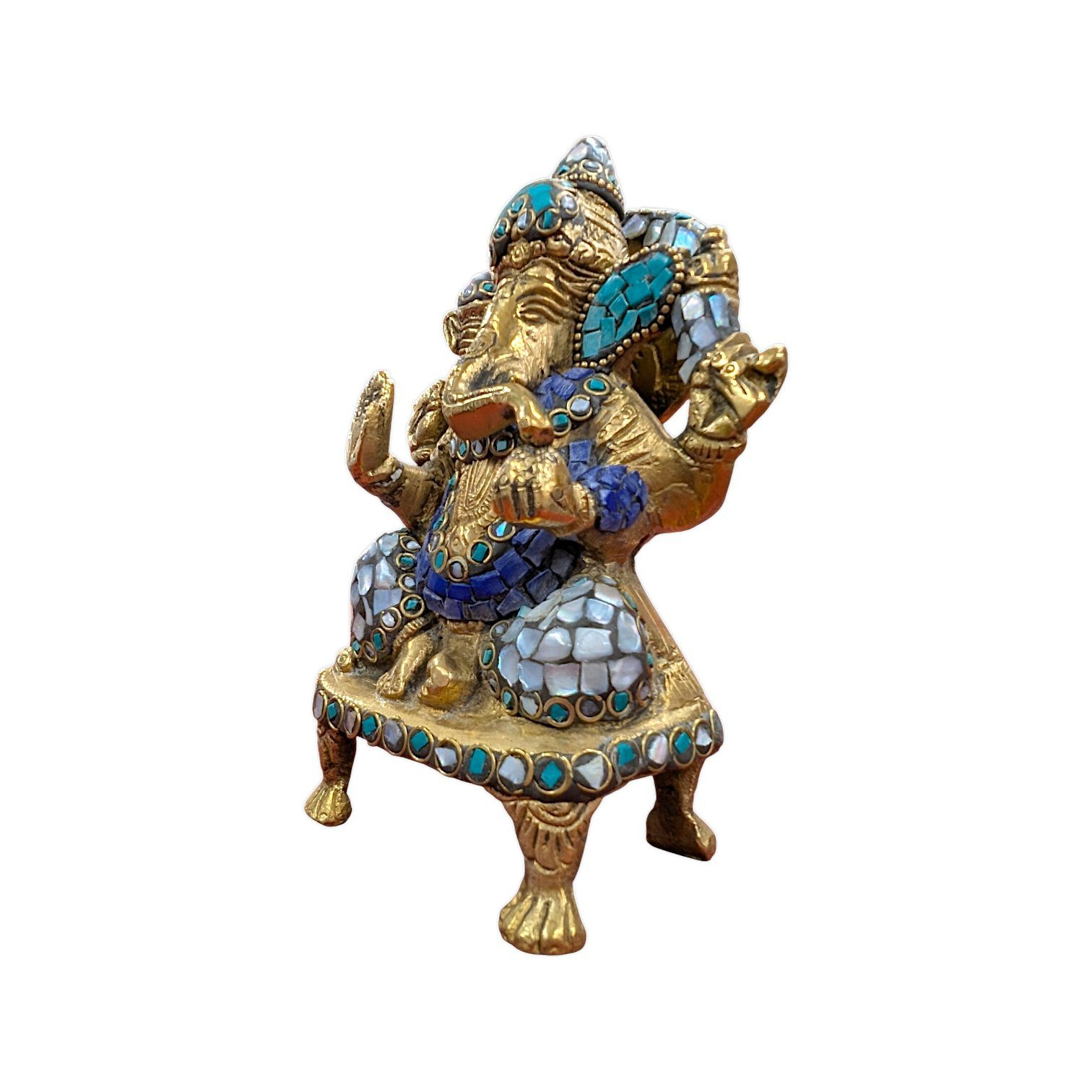 Add a touch of elegance and spirituality to your home with this exquisite Handmade Brass Ganesh Idol, beautifully crafted to showcase Lord Ganesh seated majestically on a throne. This intricate piece is meticulously hand-pasted with vibrant stones arranged in a stunning mosaic pattern, adding a unique charm and artistry to the idol.