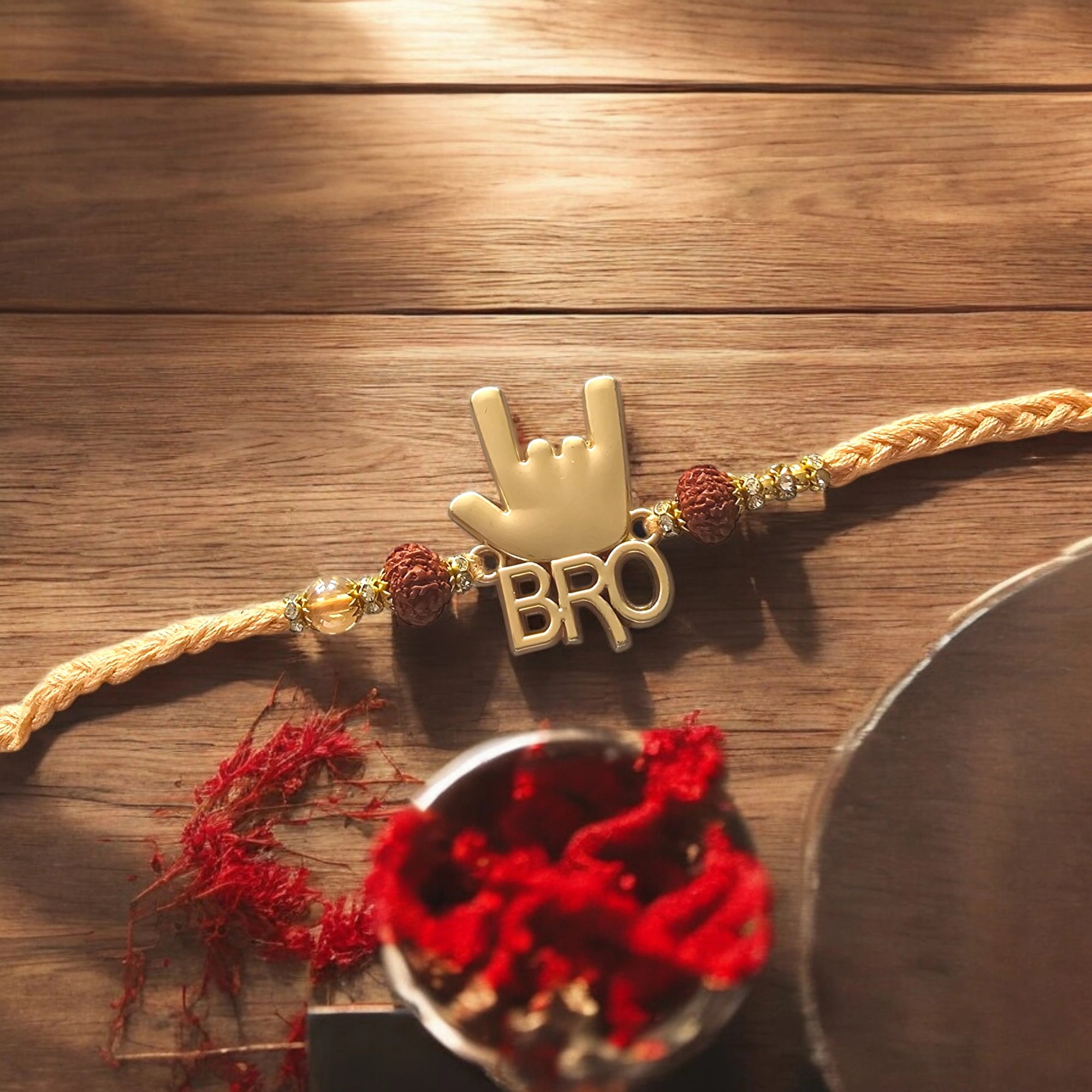 Celebrate your superhero sibling! This vibrant knotted Rakhi features a sleek “Cool Bro” emblem with real rudraksha beads – a daily reminder of your bond. Handcrafted with durable threads and allergy-safe materials.
