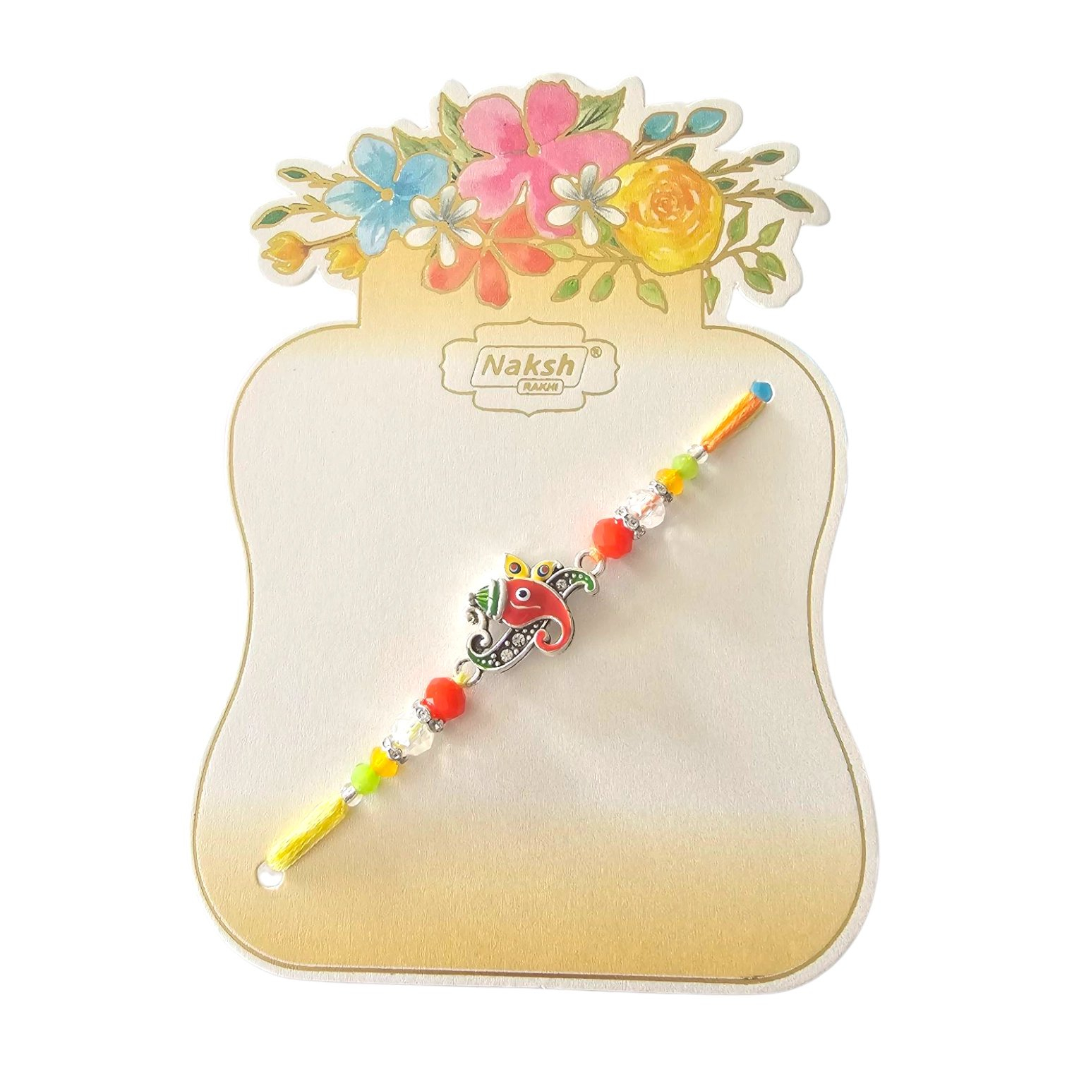 This premium Rakhi with Ganesh features an intricately crafted golden oxidized finish Ganesh emblem . This special Rakhi stands out to make a meaningful Raksha Bandhan bracelet. Gift your brother this cherished Ganesh rakhi and a create lasting memory.
