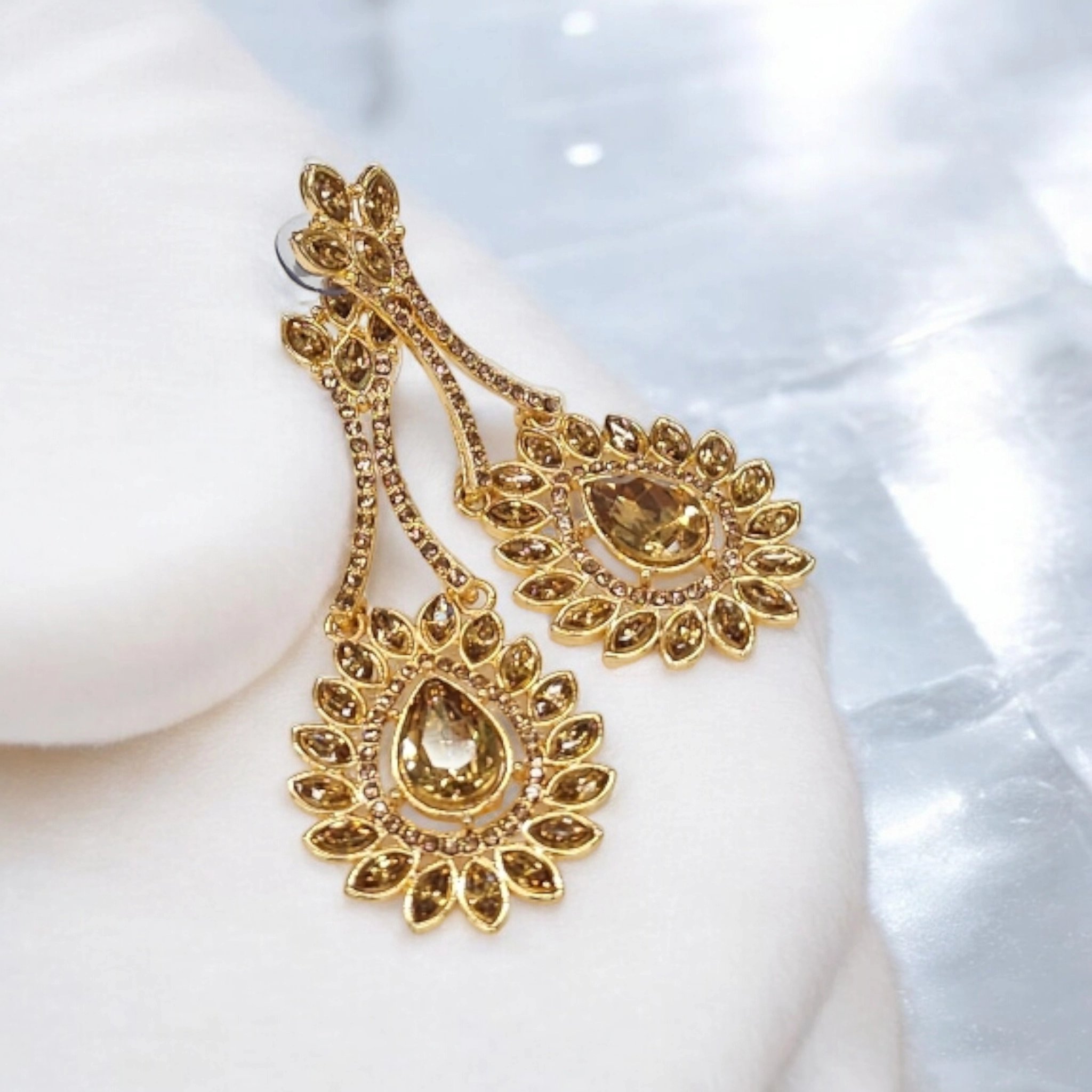 These lightweight statement earrings have a luxurious gold-plated base enhanced by a gold oxidized finish, each piece is adorned with matching stonework that catches the light with every movement.