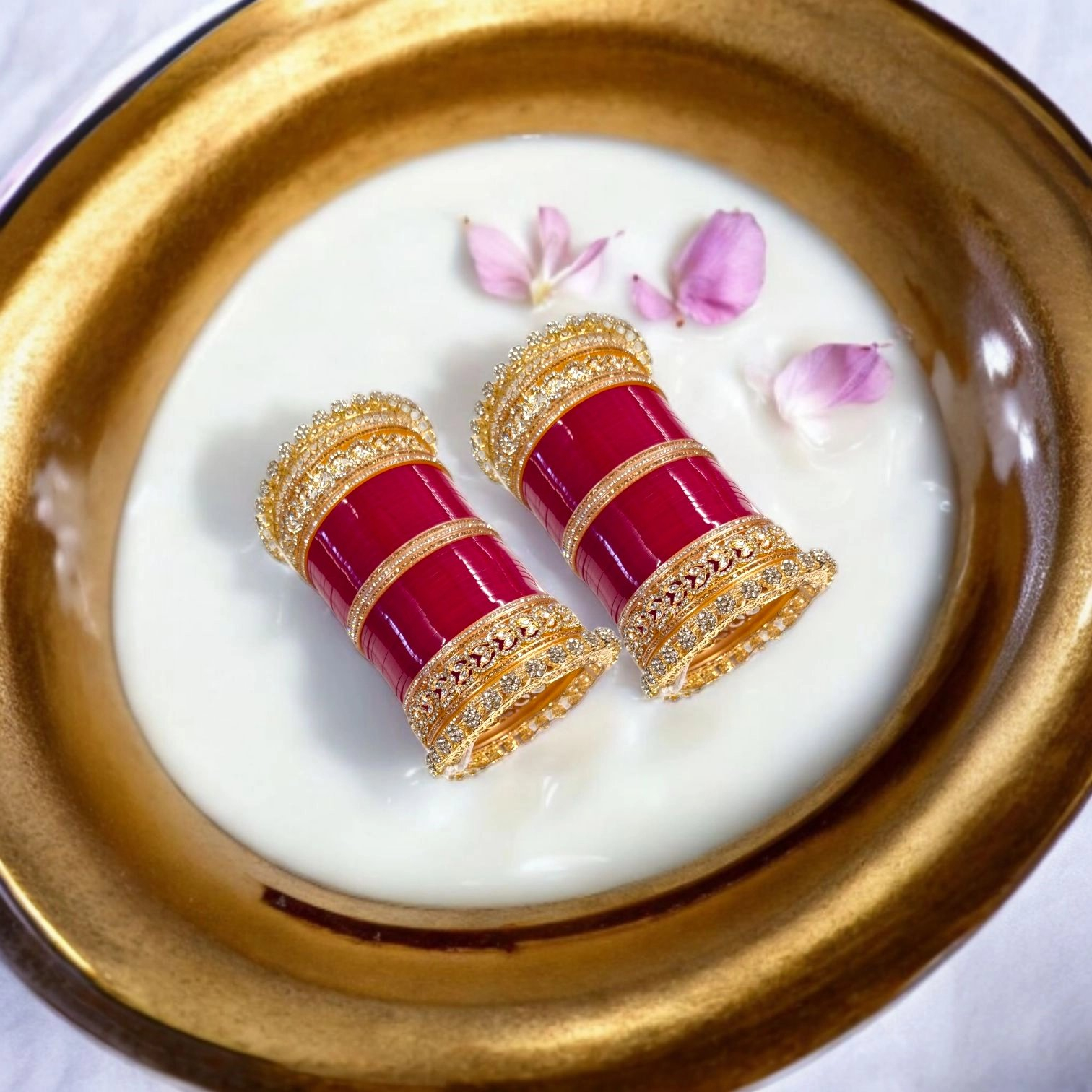 Welcome to our exclusive collection of Chura Sets, where tradition meets elegance. Our Chura’s are meticulously crafted to adorn brides with grace and beauty on their special day. Each set is a testament to the rich cultural heritage and timeless craftsmanship that goes into creating these exquisite pieces of jewelry. Our bangles are crafted by skilled artisans who have honed their craft over generations. Each piece is a work of art, reflecting intricate designs and impeccable detailing. Made with the finest materials, our Wedding chura bangles are durable and designed to last. The vibrant colors and intricate embellishments are sure to make a statement.