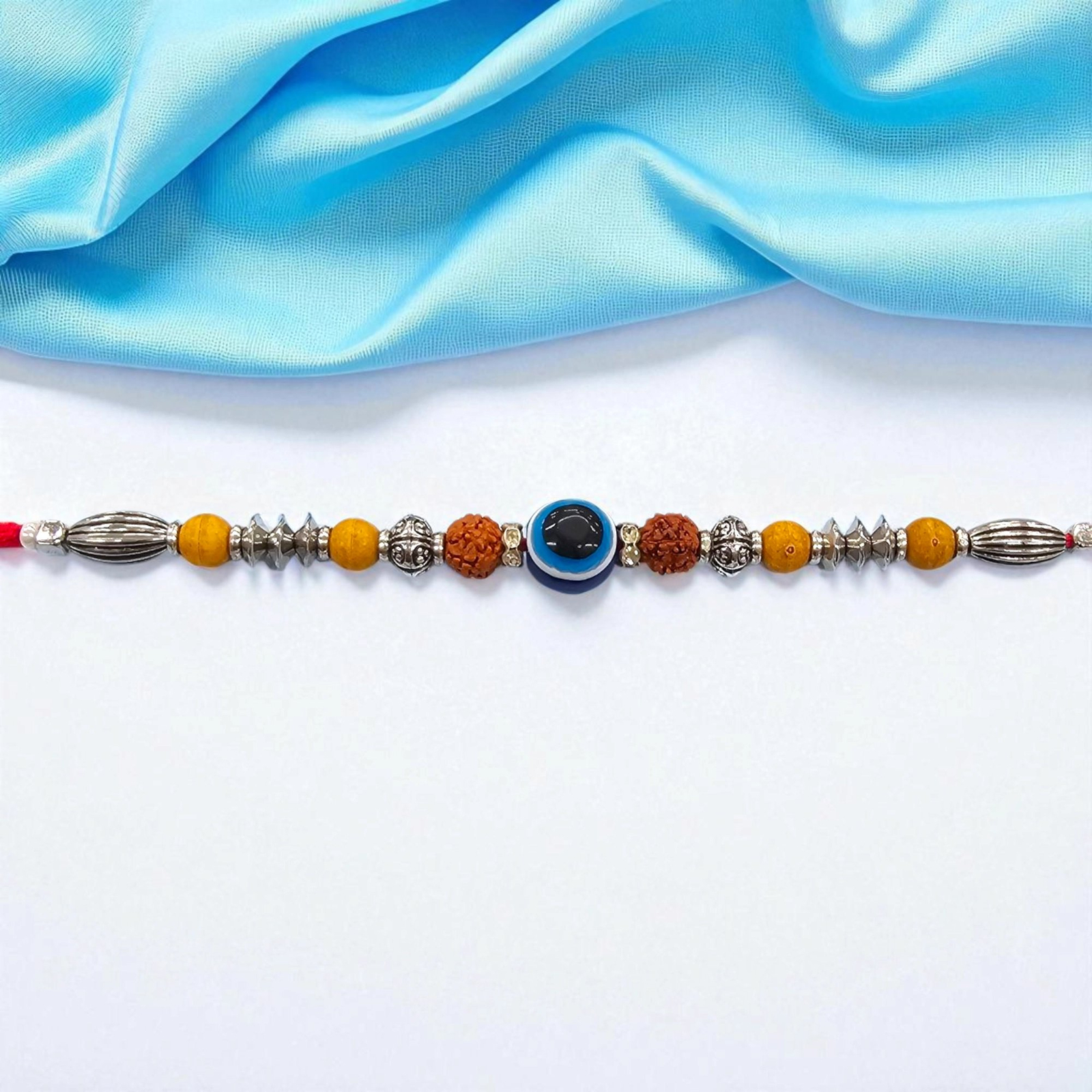 This unique evil eye rakhi features an intricately crafted. Symbolizing good luck and empowerment to achieve heartfelt desires, this special Rakhi makes a meaningful Raksha Bandhan gift. Gift your brother this cherished rakhi and create lasting memories.
