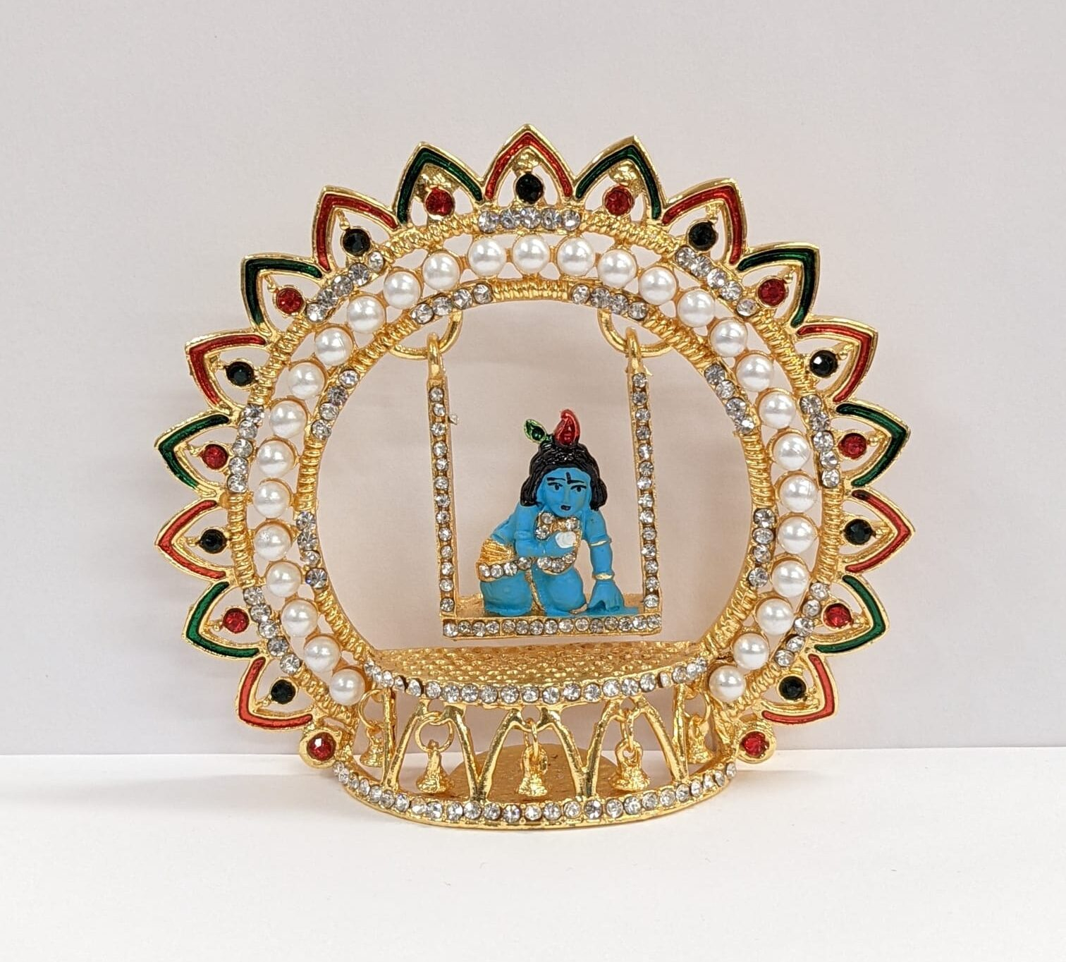 Enhance your car dashboard or home mandir with our exquisite Small Laddu Gopal on a Jhula (swing) idol. Crafted with intricate detail, this divine figurine not only adds a touch of spirituality but also serves as a charming décor piece. Elevate your space with this sacred symbol, perfect for both personal worship and aesthetic appeal.