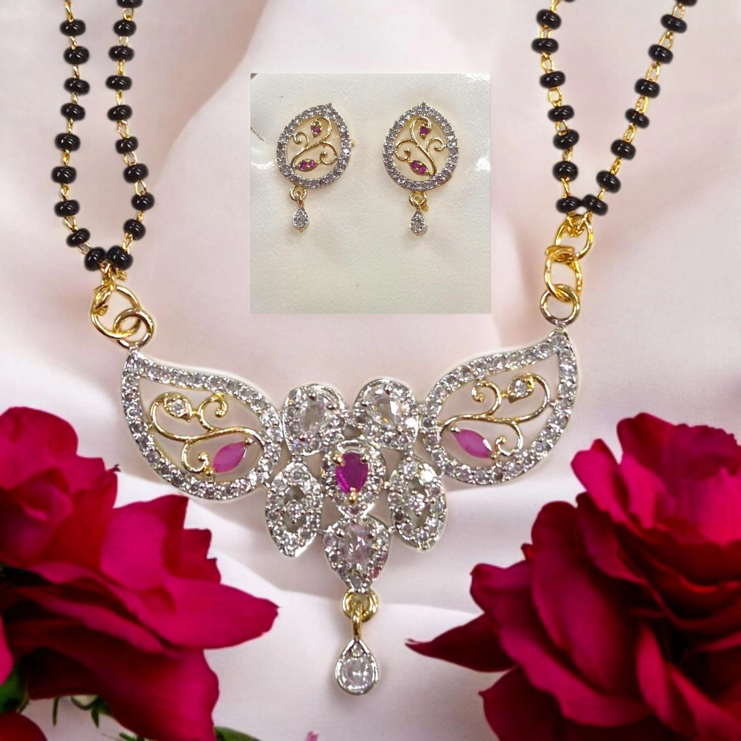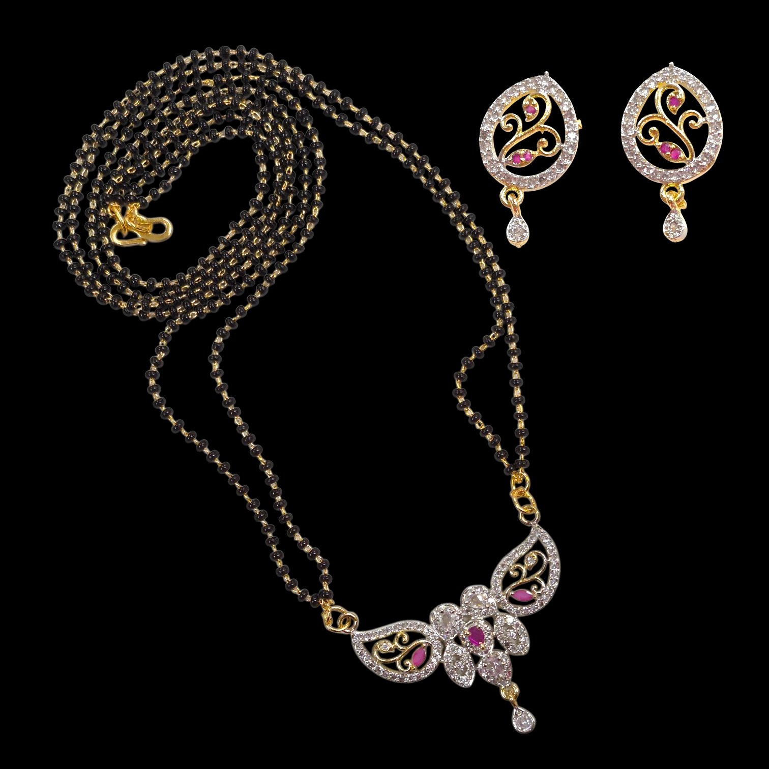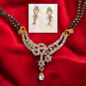 Elevate your ethnic ensemble with this exquisite AD Mangal sutra. Inspired by timeless Gold jewelry, this AD pendant with black Mangal sutra chain and matching earrings showcases intricate detailing, reflecting the skilled artistry .