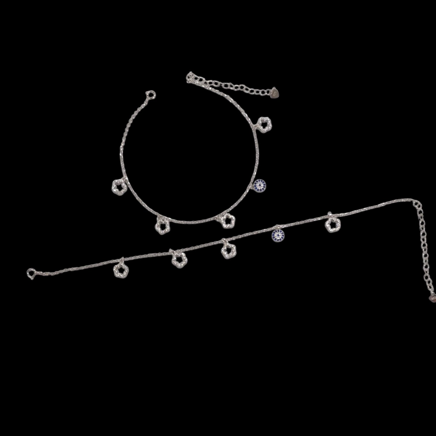Close up of the charms on the 925 sterling silver anklets – Pair of Silver anklet bracelets