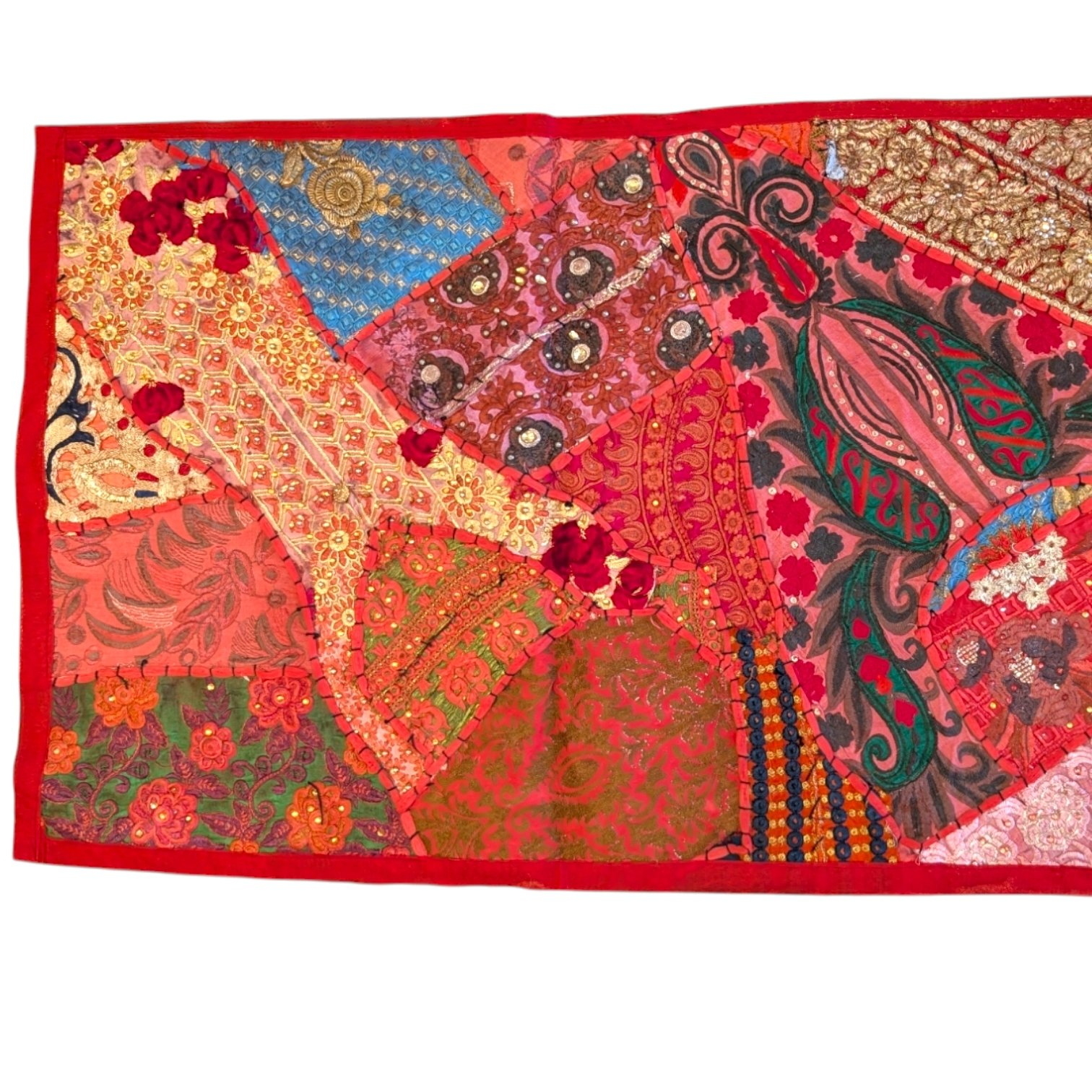 The Indian table runner was made from recycled materials, patches of vintage fabrics or wedding saris, and also beads, laces, sequins and mirrors. The Khambadiya artisans of Rajasthan in India carefully cut and sew patches to create unique collages. It means each patchwork table runner is unique. No two pieces are the same and each piece of patch tells a story.