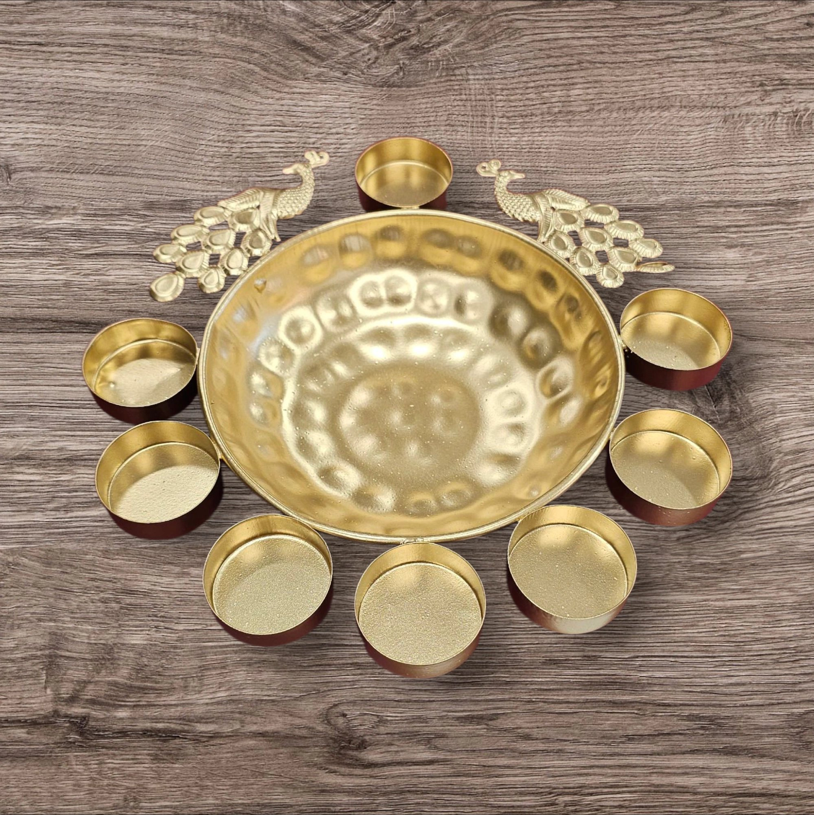 Design: Traditional hammered urli bowls with elegant peacock motifs & diya holders