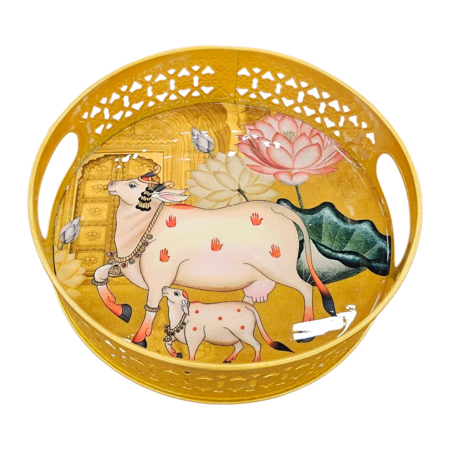 Elevate your home décor with traditional Indian Pichwai artwork with cow on a set of 2 Jars with a matching tray for a perfect Diwali gift. These Metal jars with tray set is perfect for adding a festive charm to your kitchen counter, dining table, or as a house warming gift.