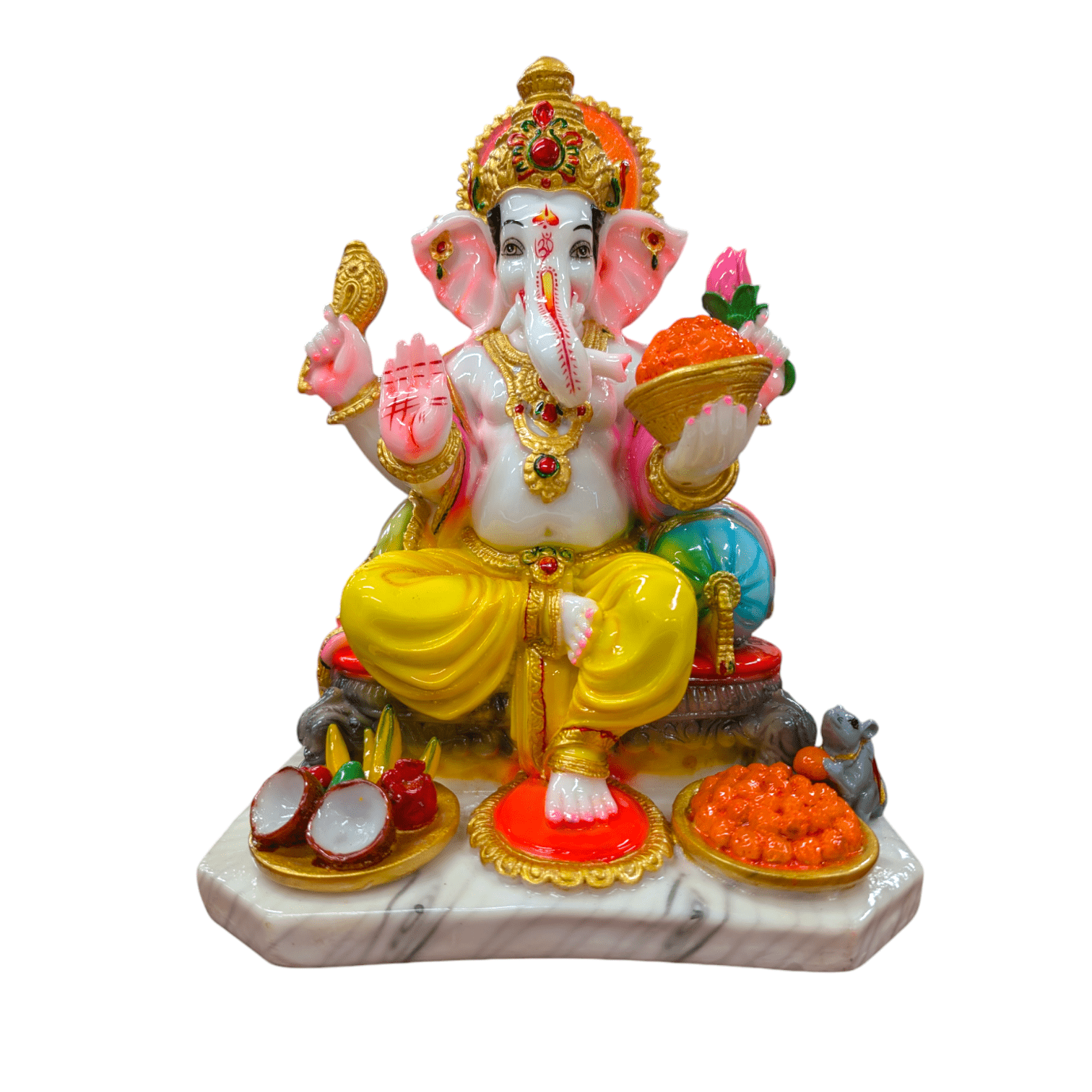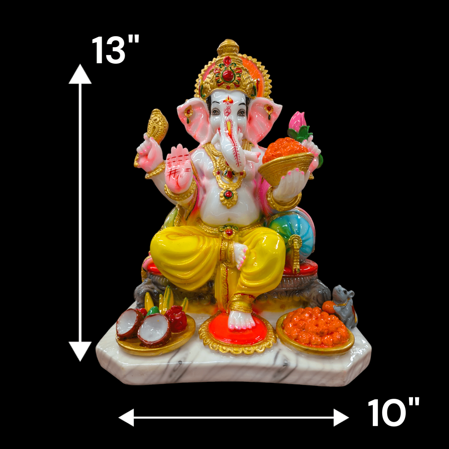 A beautiful and mesmerizing Ganesha Idol 13 inch high approx 10 inches wide, with beautiful colored decorations. Perfectly crafted to inspire devotion and elegance, this exquisite idol makes an ideal centerpiece for your home mandir or living room.