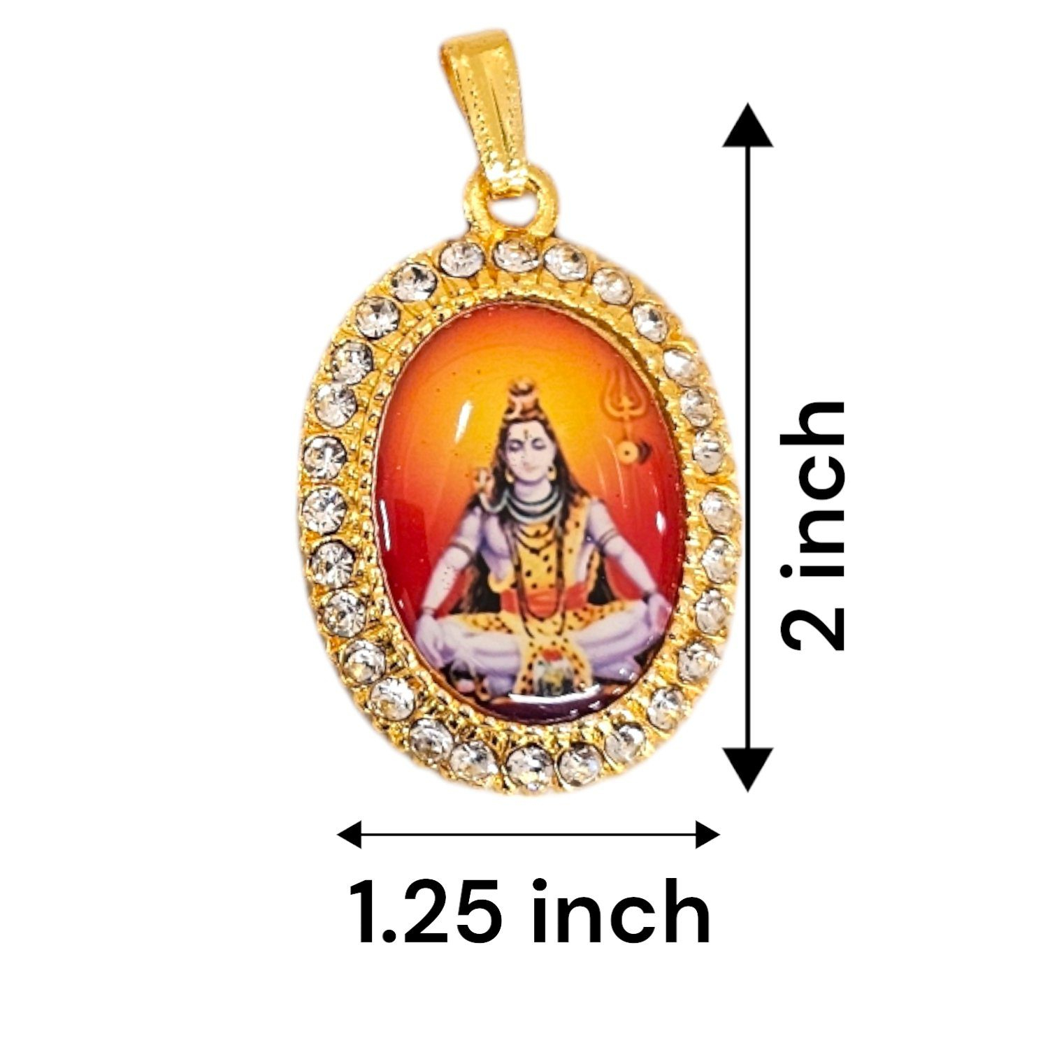 Each pendant measures 2 inches in height and 1.25 inches in width, showcasing a mesmerizing image of Shiv ji encased in a luxurious gold-plated border adorned with intricate stonework.