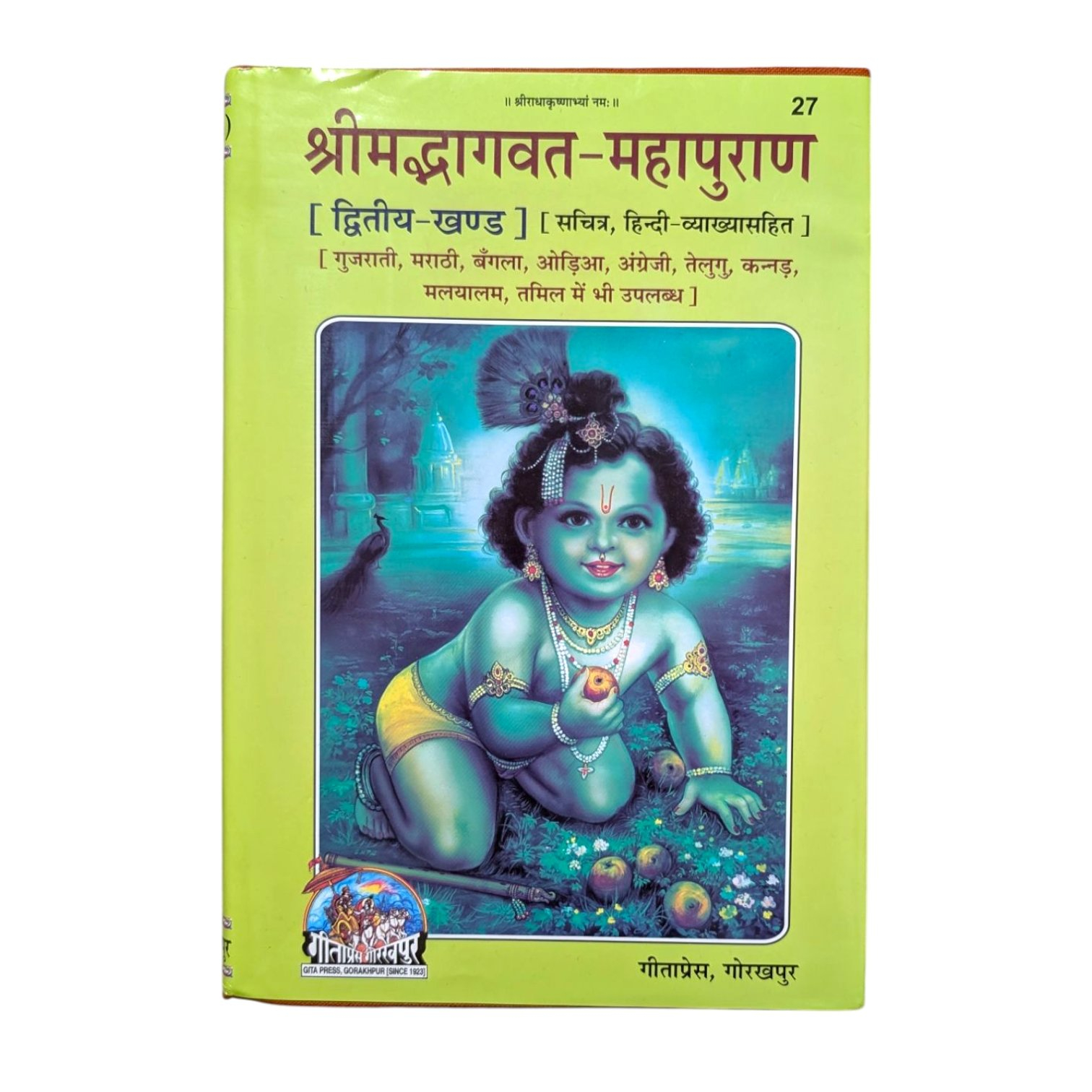Buy the Gita Press edition of Shrimad Bhagwat MahaPuran Part 1 and 2 . These are a Sachitra (illustrated) version, accompanied by a detailed Hindi transalation, making it accessible and enlightening for devotees and seekers alike. This combo pack includes both Part 1 and Part 2, covering the complete scripture.