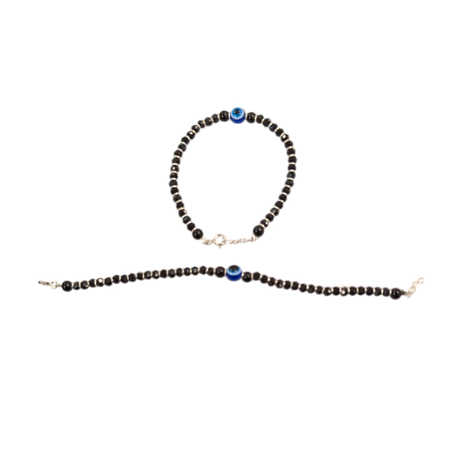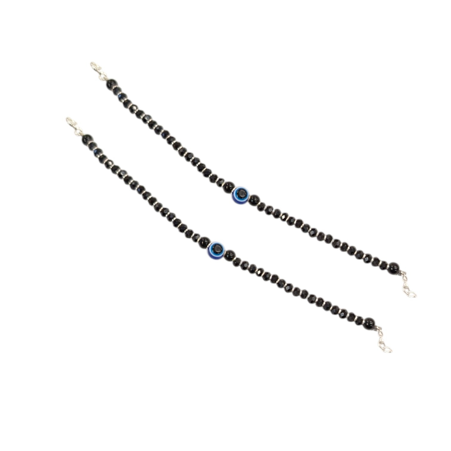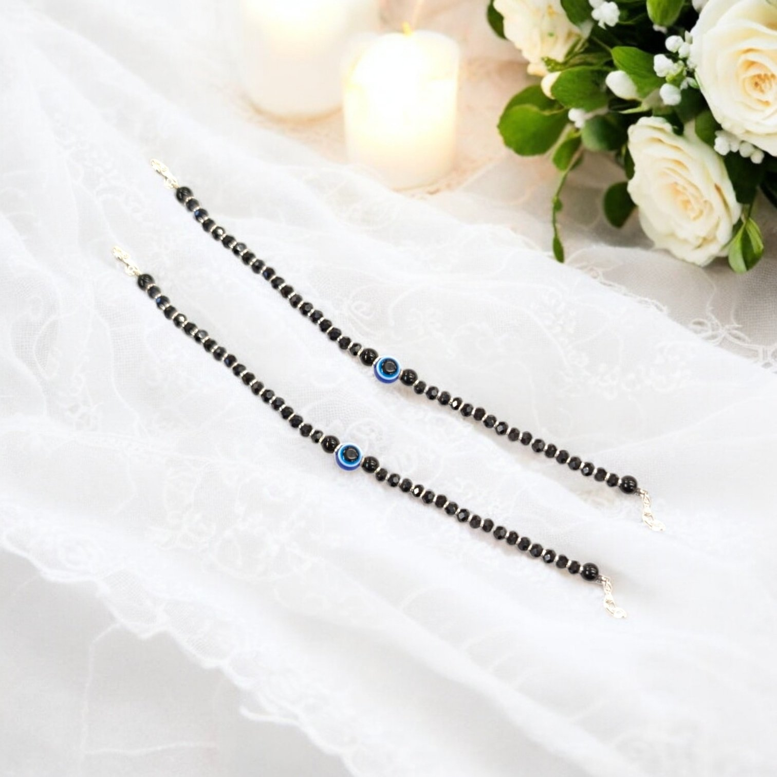 Embrace tradition and elegance with this Sterling Silver Nazaria chain Bracelet, designed for infants. Featuring a chain bracelet with pure silver rings placed between black glass beads with a evil eye in center, this piece blends cultural significance with modern sophistication.