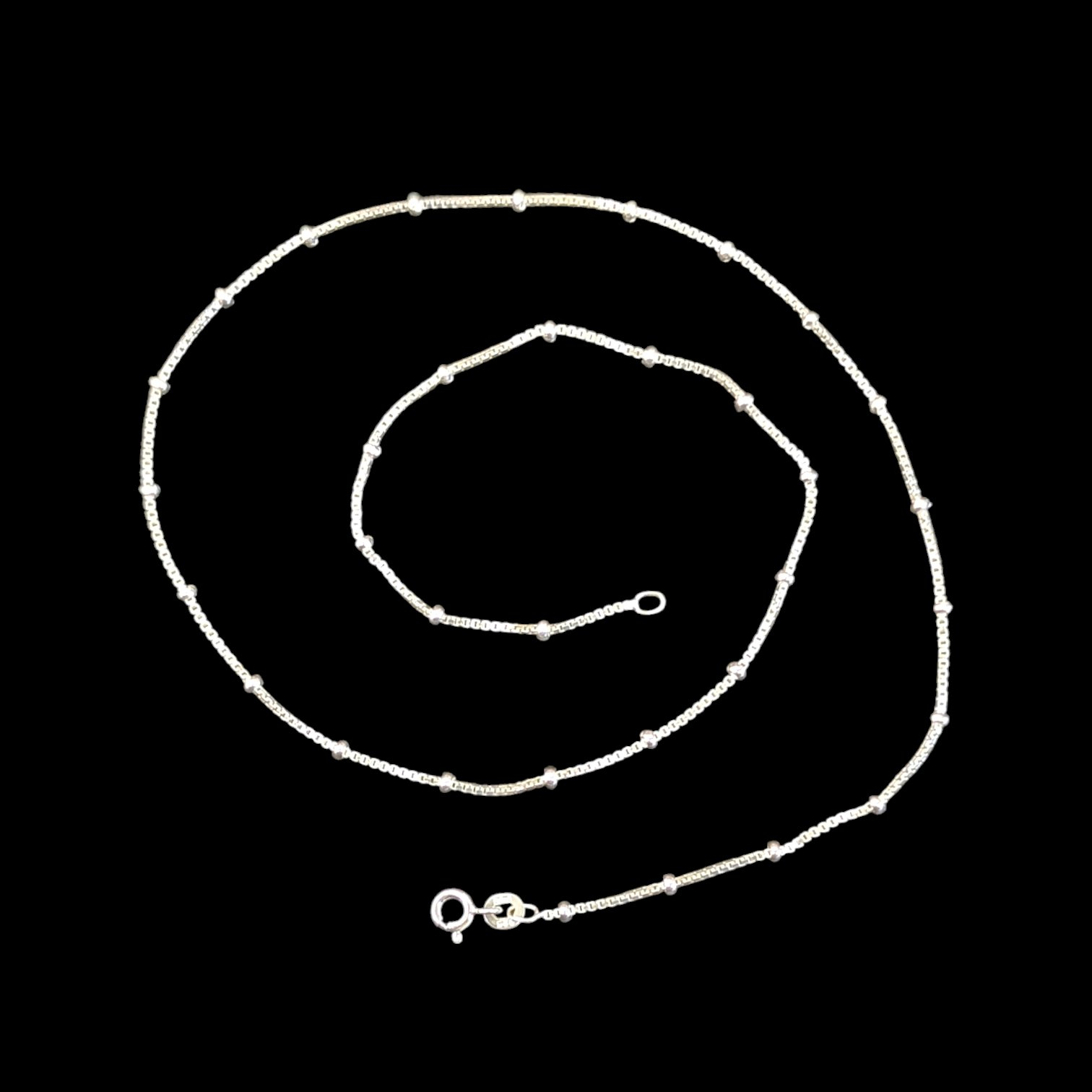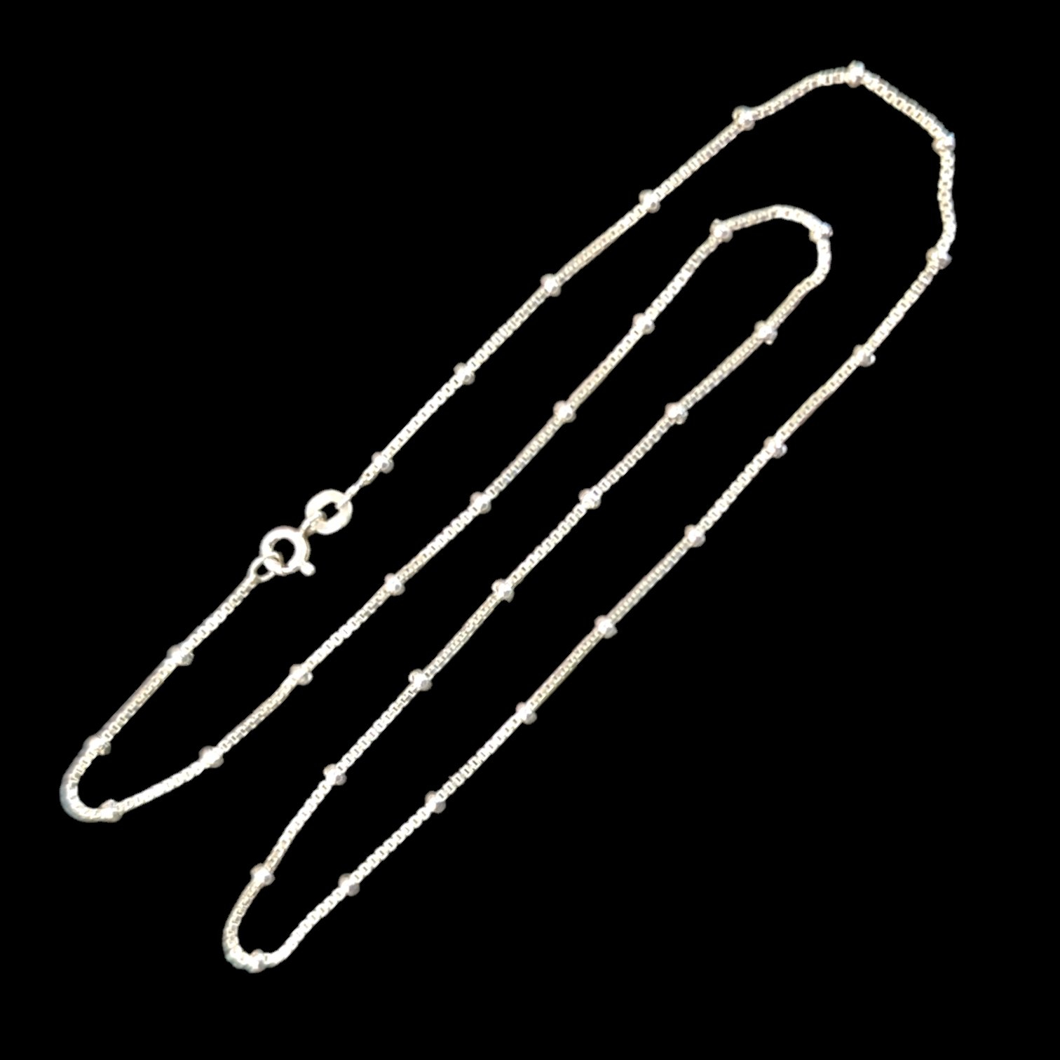 EVERYDAY NECKLACE DAINTY : 1mm premium silver 18 inch box chain with 2mm balls and strong and secure lobster clasp. Lightweight and comfortable and tangle free.