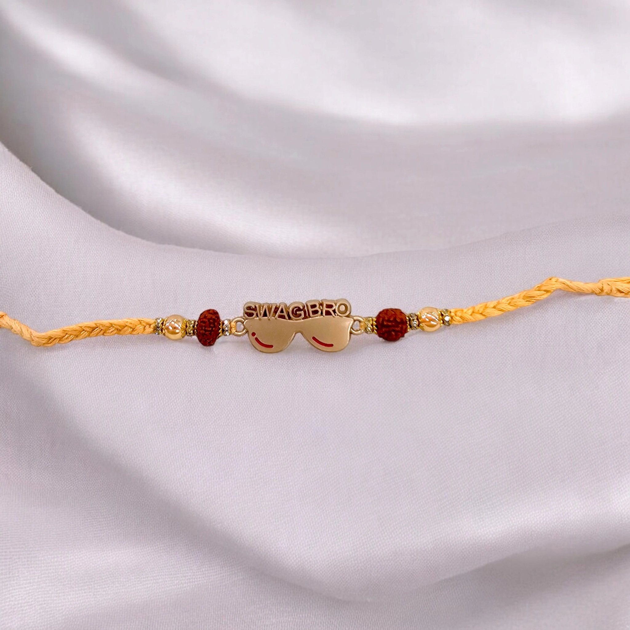 Celebrate your superhero sibling! This vibrant knotted Rakhi features a sleek “Swag Bro” emblem with rudraksha beads – a daily reminder of your bond. Handcrafted with durable threads and allergy-safe materials.