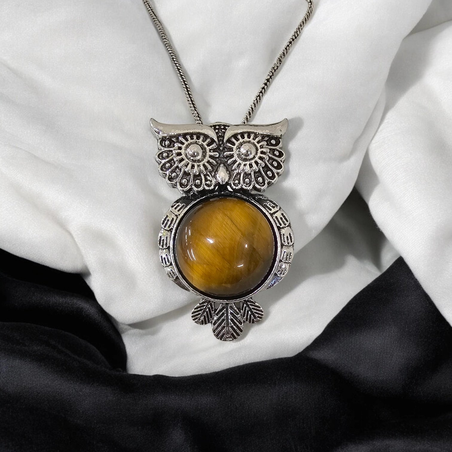 Channel strength and confidence with this handcrafted owl Pendant Necklace, showcasing a striking natural Tiger Eye stone set in sleek nickel-free silver-plated brass. Merging earthy power with timeless elegance, this unisex design is perfect for daily wear, spiritual rituals, or adding a bold accent to any outfit.