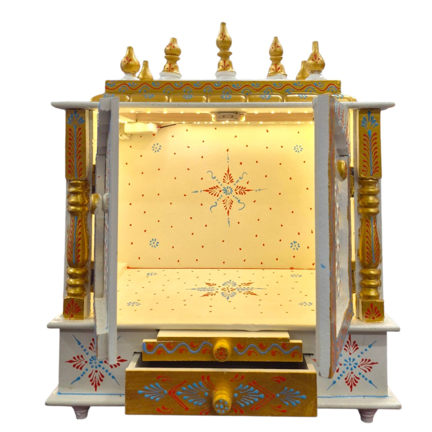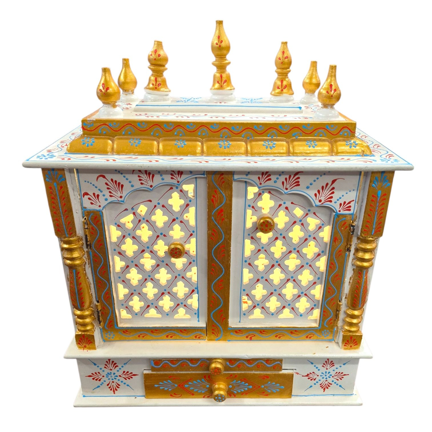 Its compact yet ample size makes it ideal for housing your idols, ensuring a peaceful, dedicated space for worship. The solid wood construction not only guarantees durability but also adds a timeless elegance, showcasing intricate hand-painted details that reflect the rich heritage of Rajasthani craftsmanship.