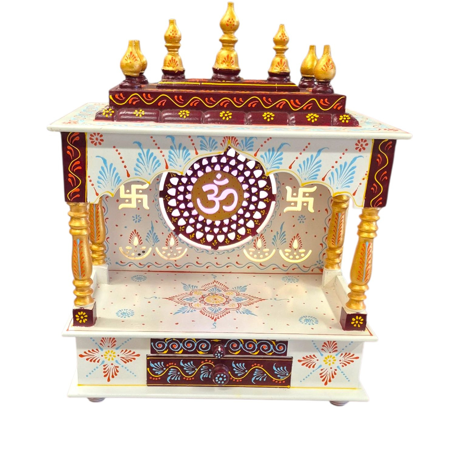 Its compact yet ample size makes it ideal for housing your idols, ensuring a peaceful, dedicated space for worship. The solid wood construction not only guarantees durability but also adds a timeless elegance, showcasing intricate hand-painted details that reflect the rich heritage of Rajasthani craftsmanship.