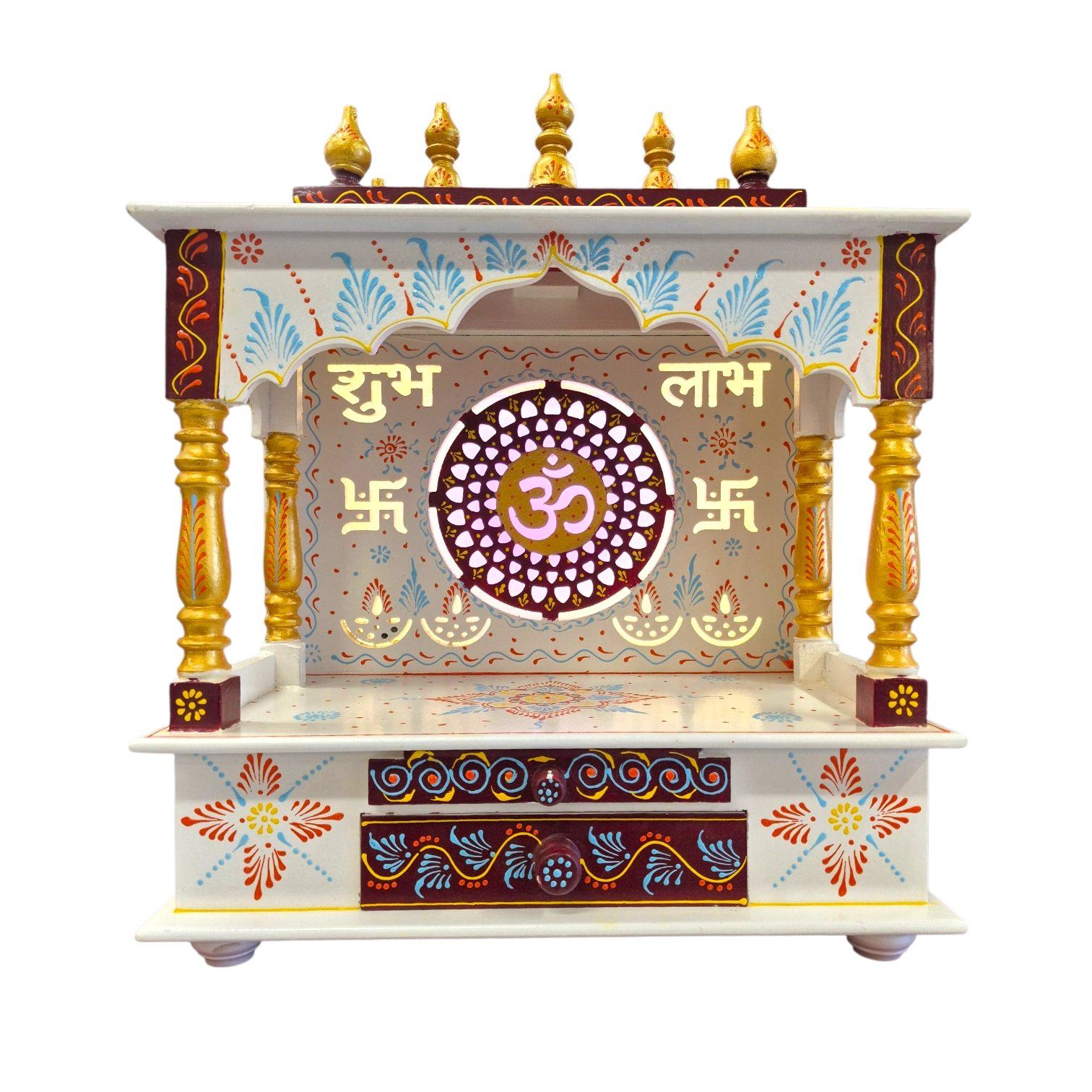 Discover the perfect addition to your home with our exquisitely crafted, hand-painted wooden Mandir. This beautifully designed temple, meticulously crafted by skilled Rajasthani artisans, is made from high-quality hardwood, with a LED Om MDF backlit Panel, adding warmth and serenity to your space.
