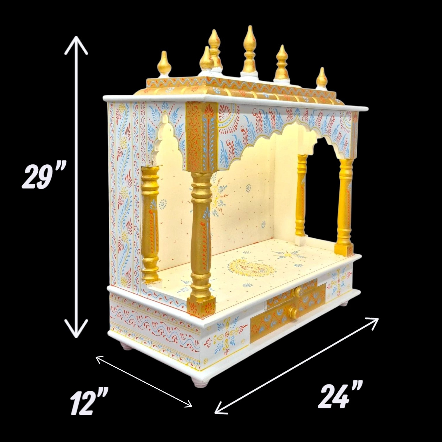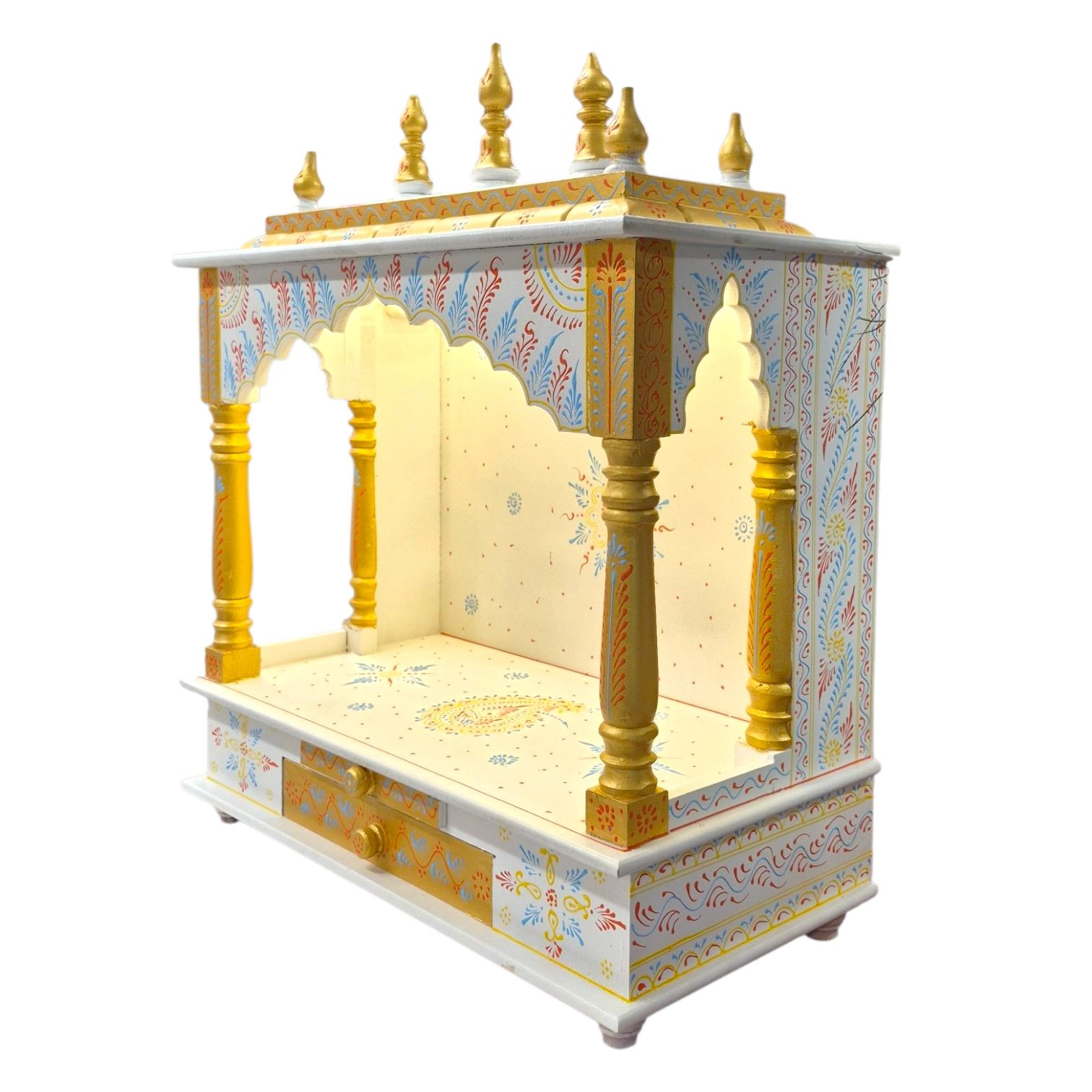 Its compact yet ample size makes it ideal for housing your idols, ensuring a peaceful, dedicated space for worship. The solid wood construction not only guarantees durability but also adds a timeless elegance, showcasing intricate hand-painted details that reflect the rich heritage of Rajasthani craftsmanship.