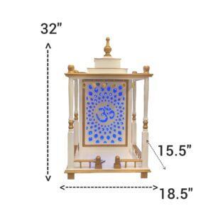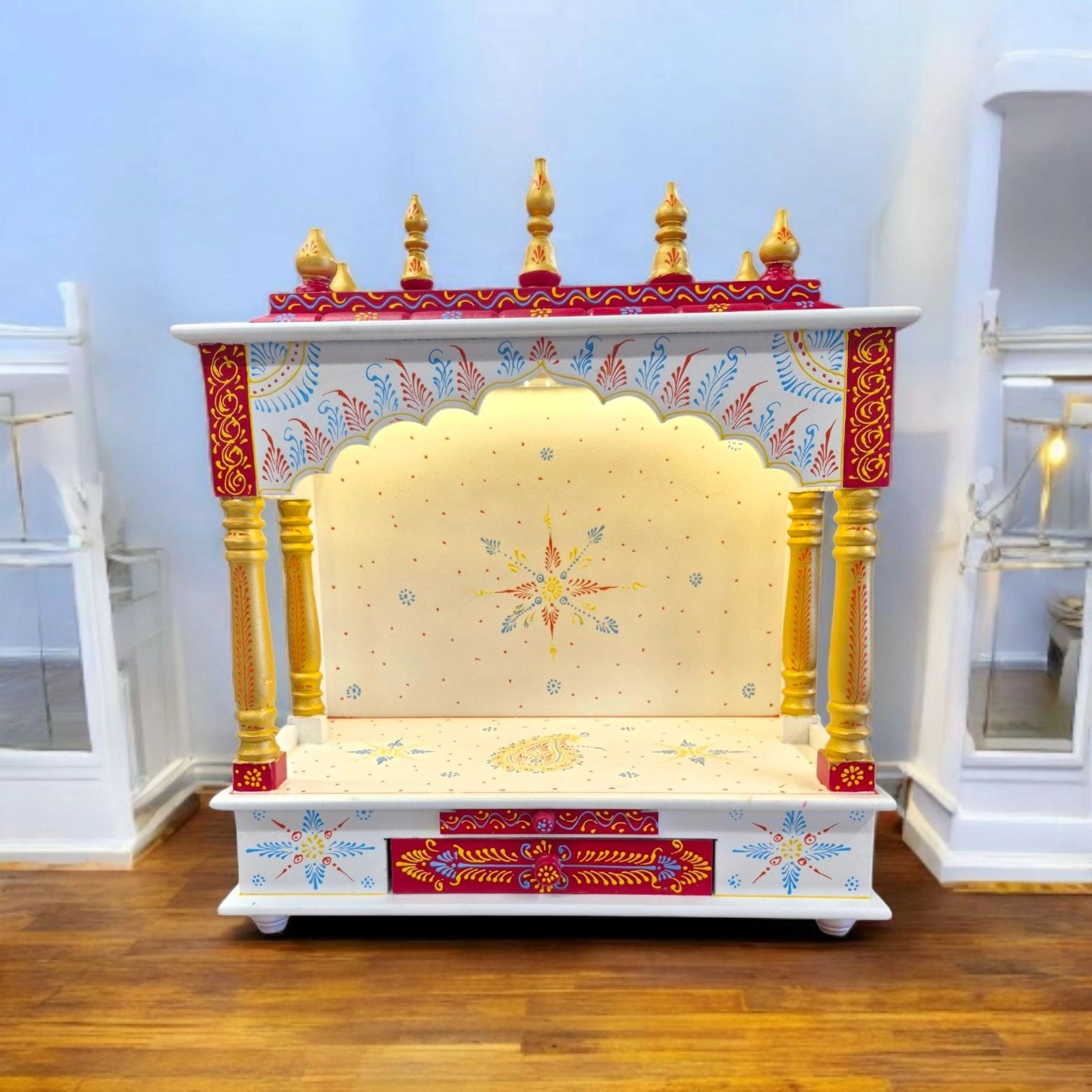Discover the perfect addition to your home with our exquisitely crafted, hand-painted wooden Mandir. This beautifully designed temple, meticulously crafted by skilled Rajasthani artisans, is made from high-quality hardwood, with a subtle LED light, adding warmth and serenity to your space.