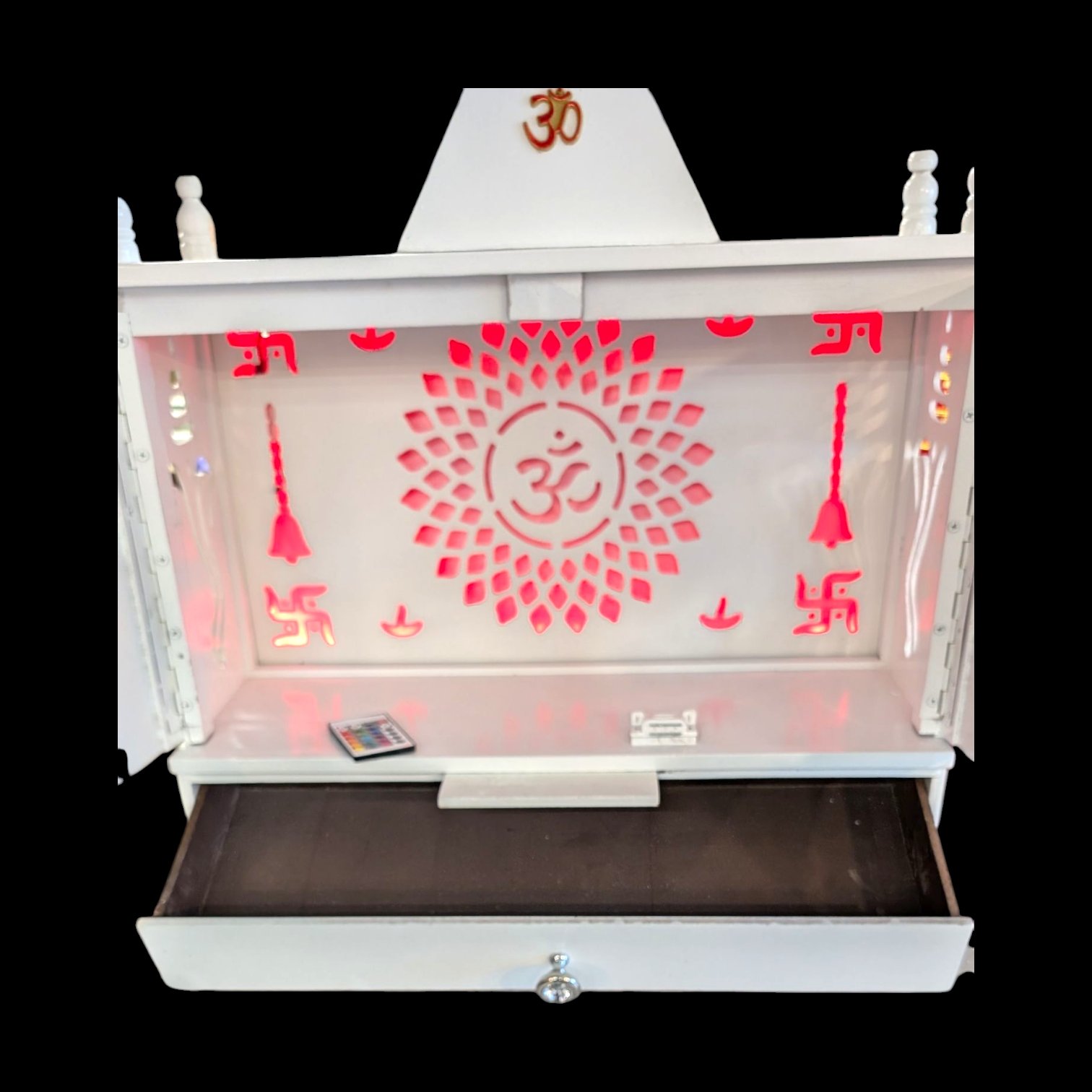 Its compact yet ample size makes it ideal for housing your idols, ensuring a peaceful, dedicated space for worship. The wood construction not only guarantees durability but also adds a timeless elegance, showcasing intricate laser cut front doors and Om led panel.