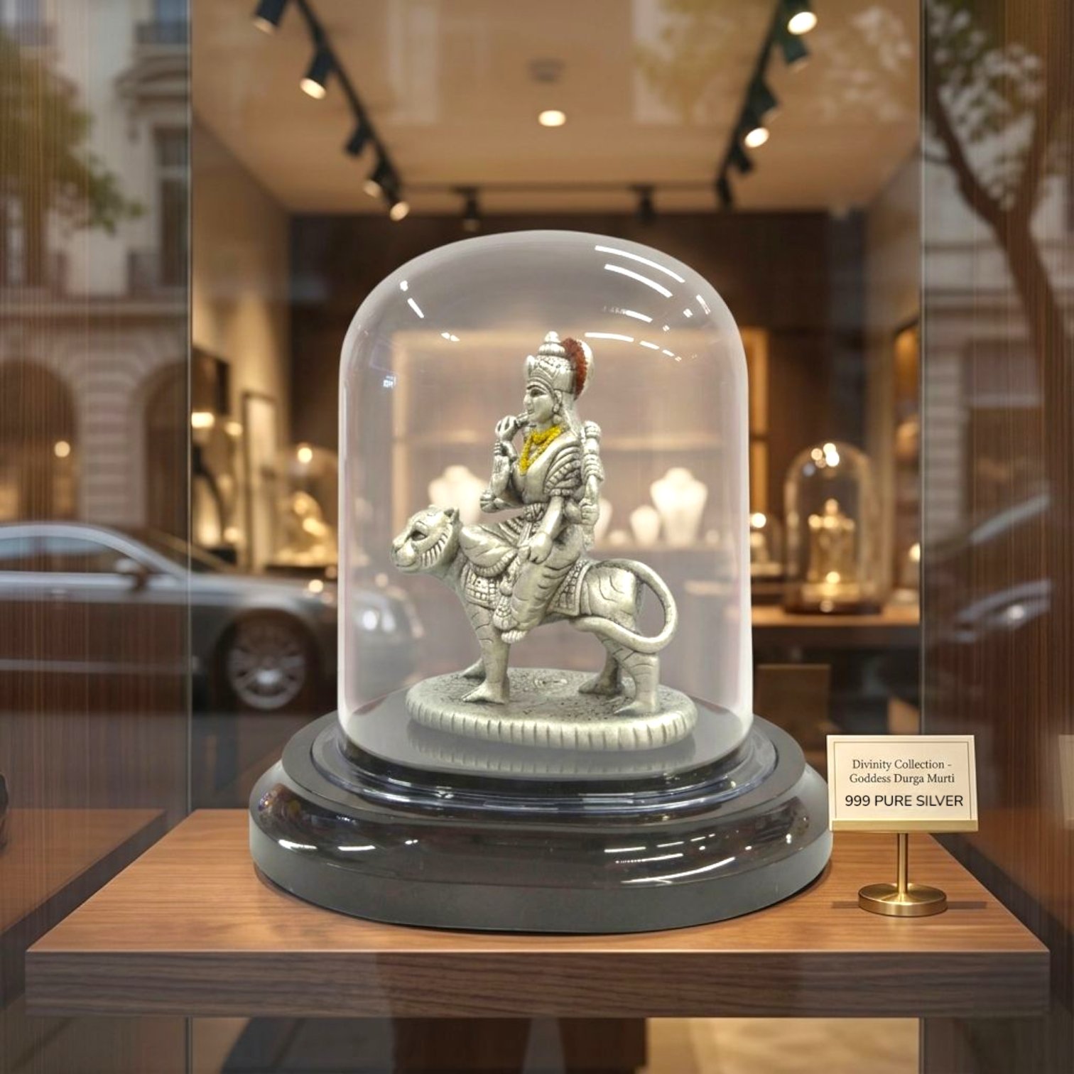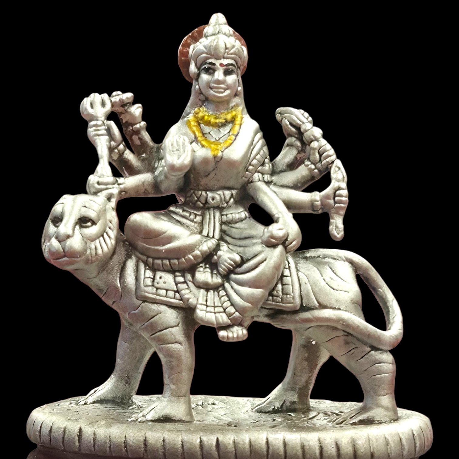 999 Pure Silver GODDESS DURGA / AMBE MAA Silver idol is made of 99.9% pure silver and placed inside a hard acrylic NON-Removable Oval transparent cover. Reference Idols were first crafted in clay by Skilled and Reputed Sculptors and then converted into Silver Form, conforms to Vastu and Indian religious traditions. Made with Excellent Silver hardness and superior quality.
