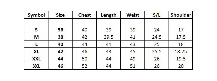 S Size - 40 ,M Size 38 ,L 36 ,XL Size 42 ,XXL Size 44 |