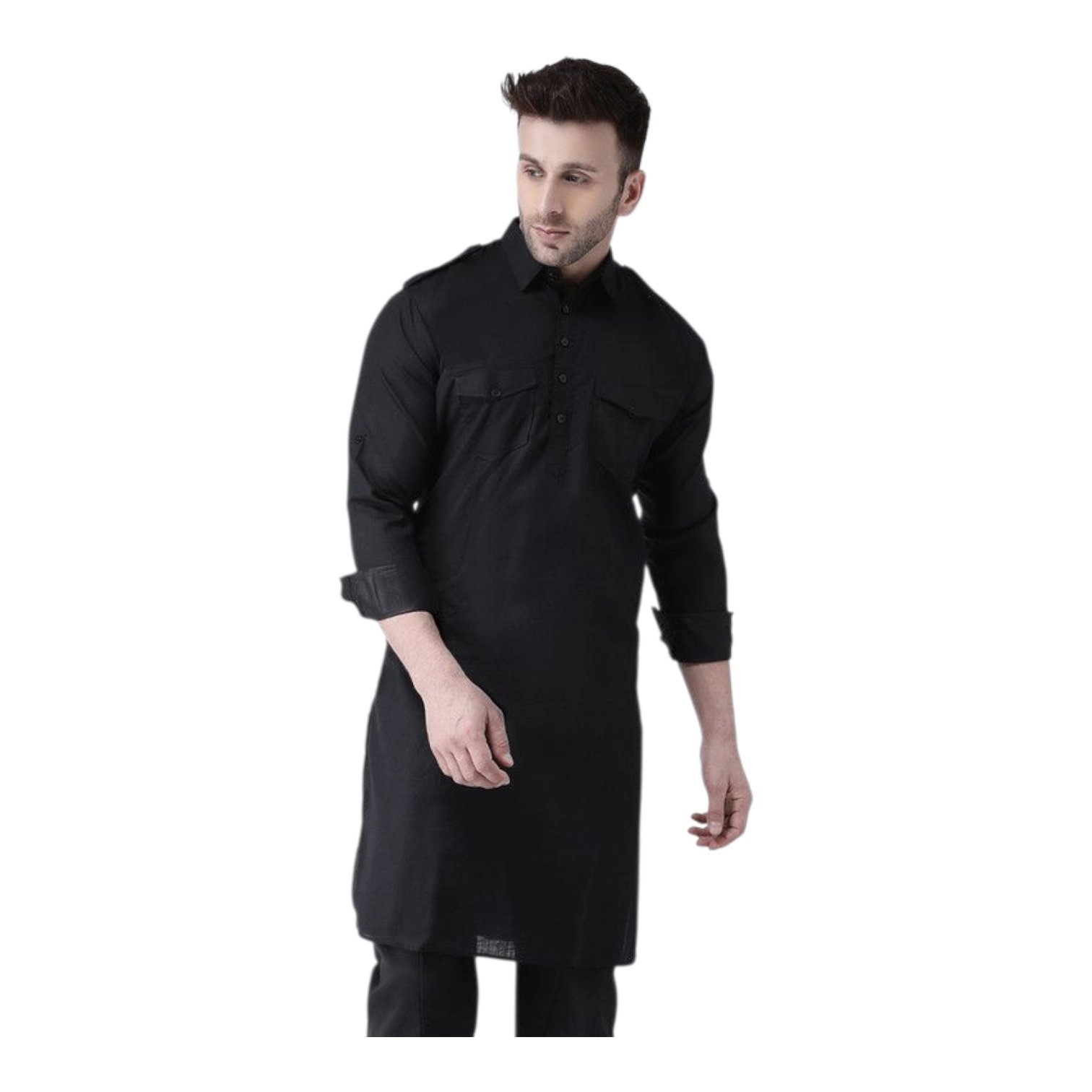 Elevate your ethnic wardrobe with this classic Black Plain Pathani Suit, crafted for a bold and sophisticated look. Designed in a traditional Pathani silhouette, this stitched ensemble blends timeless style with a modern, designer finish—perfect for festive gatherings, parties, or cultural occasions.