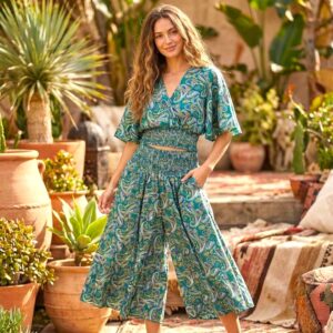 - Features: Includes practical elements like side pockets and a high-waisted, smocked elastic waistband and cinched ankles to keep the fabric in place.