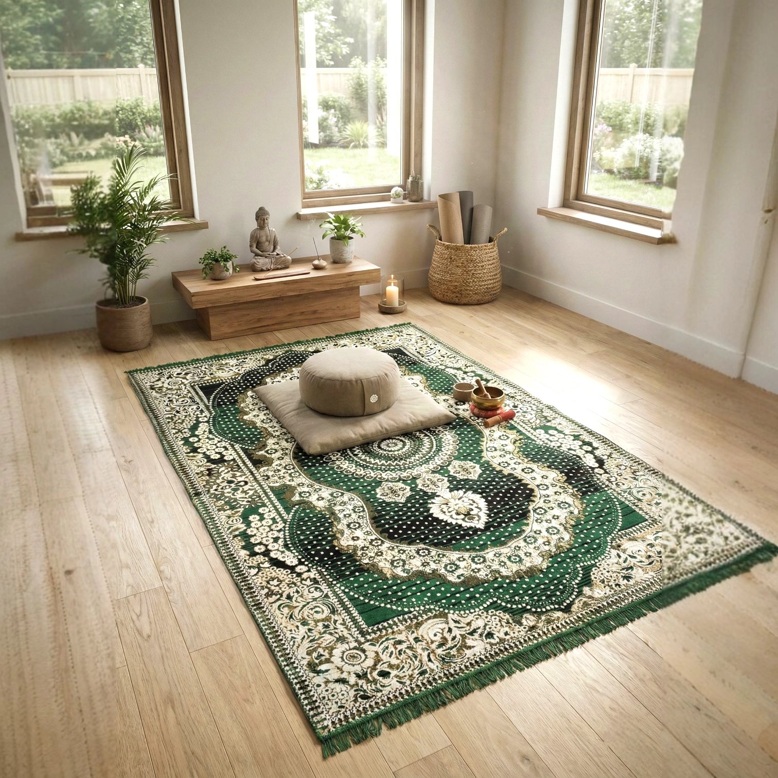A statement of quiet opulence, this green medallion rug is crafted in India using traditional weaving techniques refined over generations. Rich in detail yet elegantly balanced, the design features a central medallion framed by ornate floral motifs, creating a sense of depth, symmetry, and timeless sophistication.