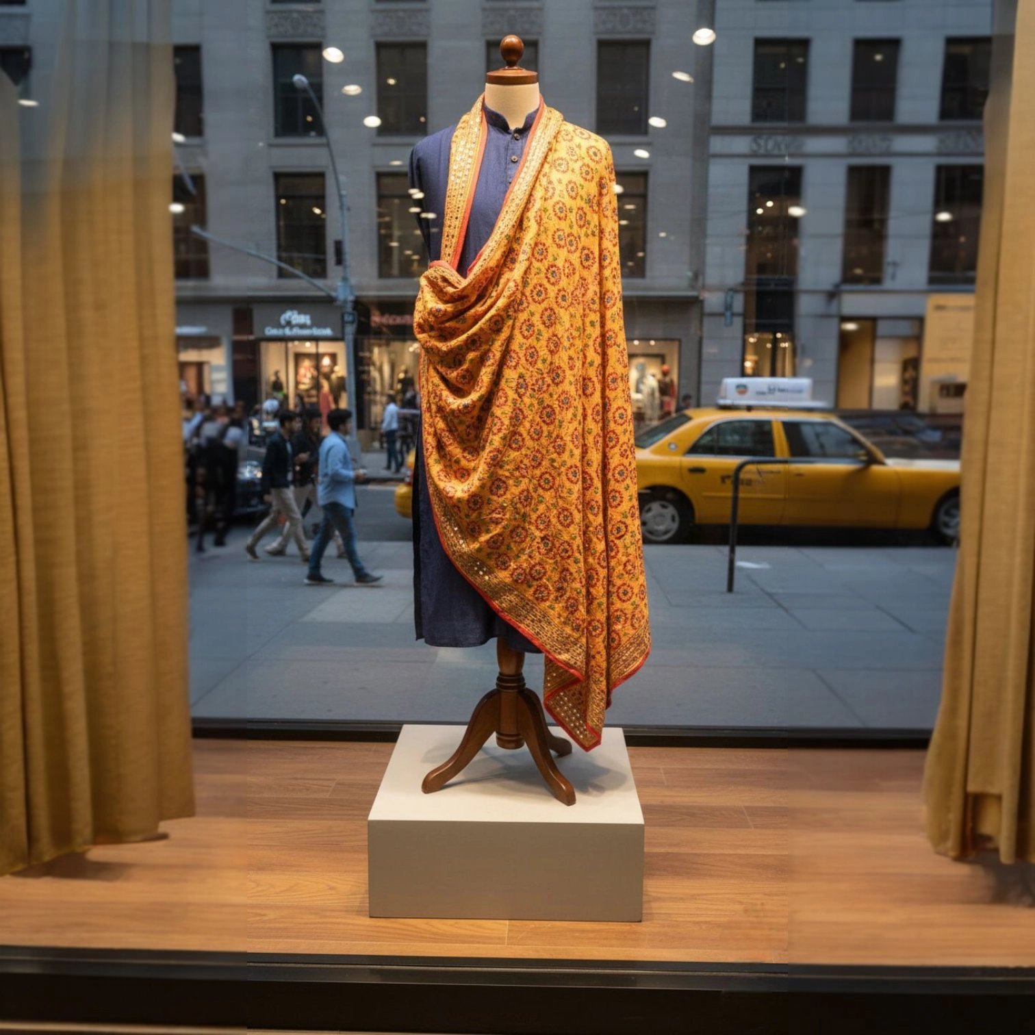 Generously sized at 32 x 84 inches, it can be styled in multiple ways—draped over the shoulders, wrapped as a shawl, or layered with your favorite ethnic outfits. Whether paired with evening wear or everyday ensembles, this faux phulkari stole brings warmth, sophistication, and timeless charm to your wardrobe.