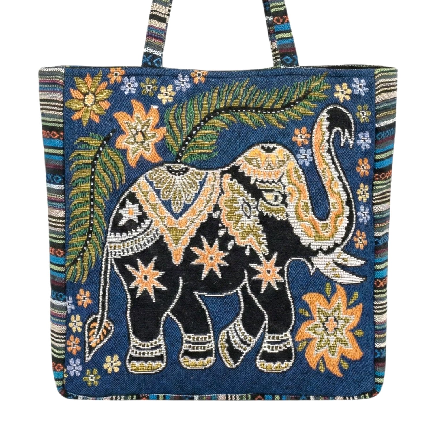 Carry your essentials in style with this unique and vibrant tote bag, handcrafted in India. This bag is more than just a functional accessory; it’s a piece of art that tells a story. The rich tapestry design features an intricately woven elephant, a symbol of wisdom and good fortune, surrounded by lush floral patterns and traditional motifs.