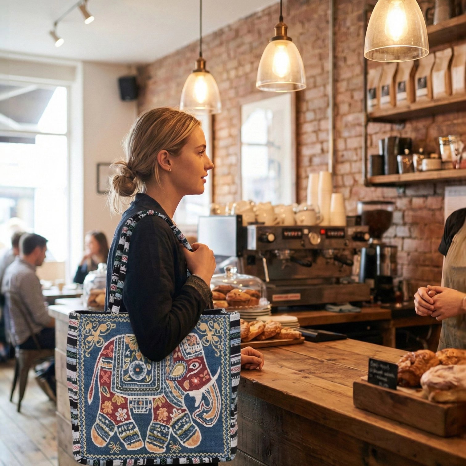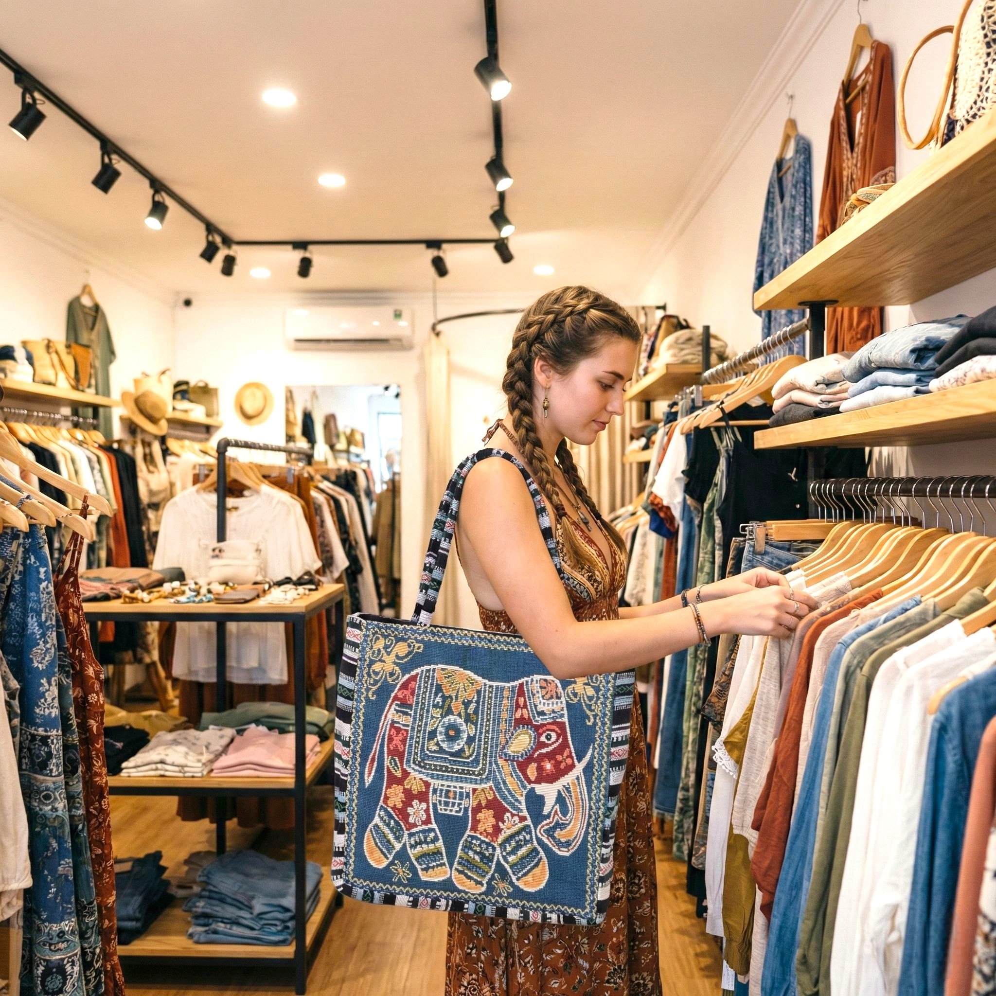 Carry your essentials in style with this unique and vibrant tote bag, handcrafted in India. This bag is more than just a functional accessory; it’s a piece of art that tells a story. The rich tapestry design features an intricately woven elephant, a symbol of wisdom and good fortune, surrounded by lush floral patterns and traditional motifs.