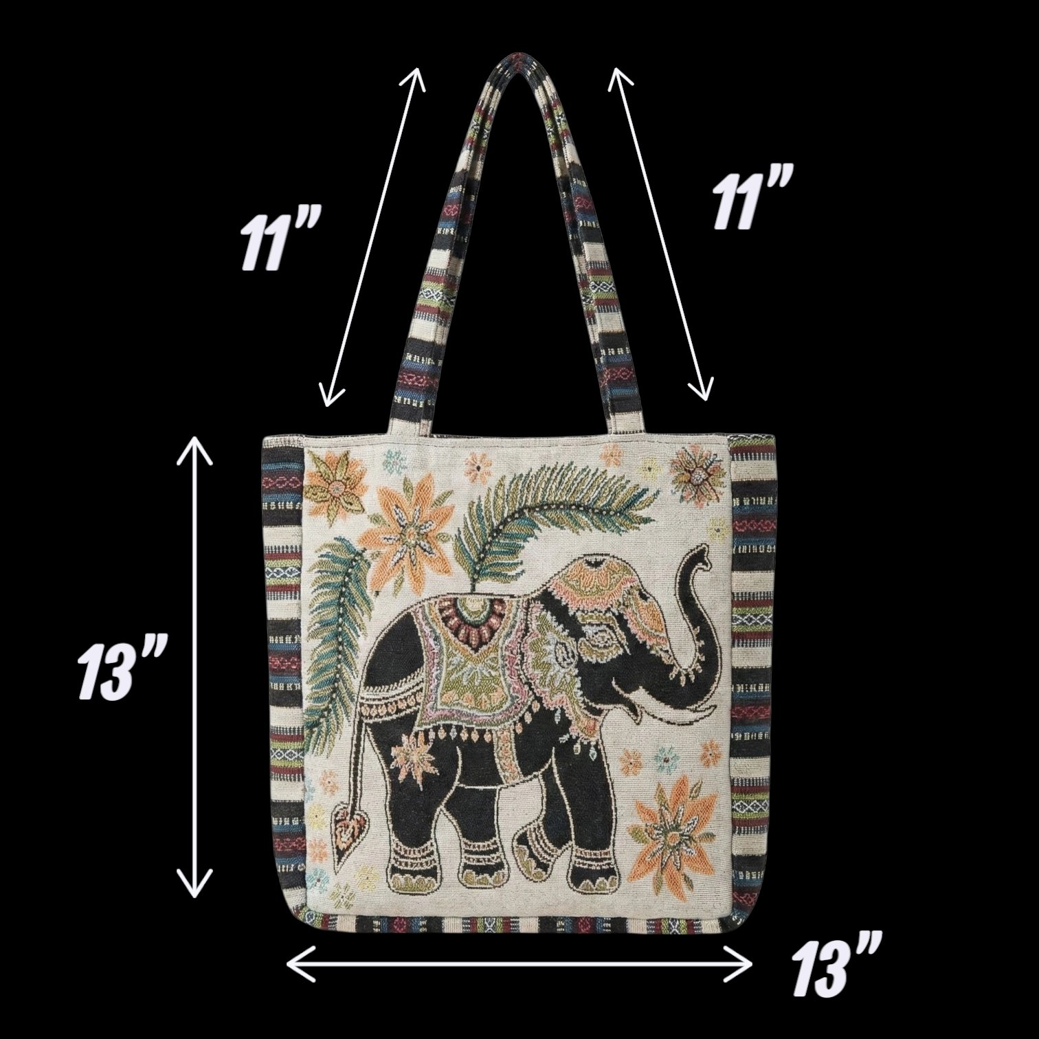 Carry your essentials in style with this unique and vibrant tote bag, handcrafted in India. This bag is more than just a functional accessory; it’s a piece of art that tells a story. The rich tapestry design features an intricately woven elephant, a symbol of wisdom and good fortune, surrounded by lush floral patterns and traditional motifs.