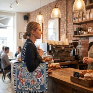 This bag features embroidered fabric material, black cotton lining, and a zipper closure. Exhibiting both substance and style this bag reflects the boldness of an adventurer.