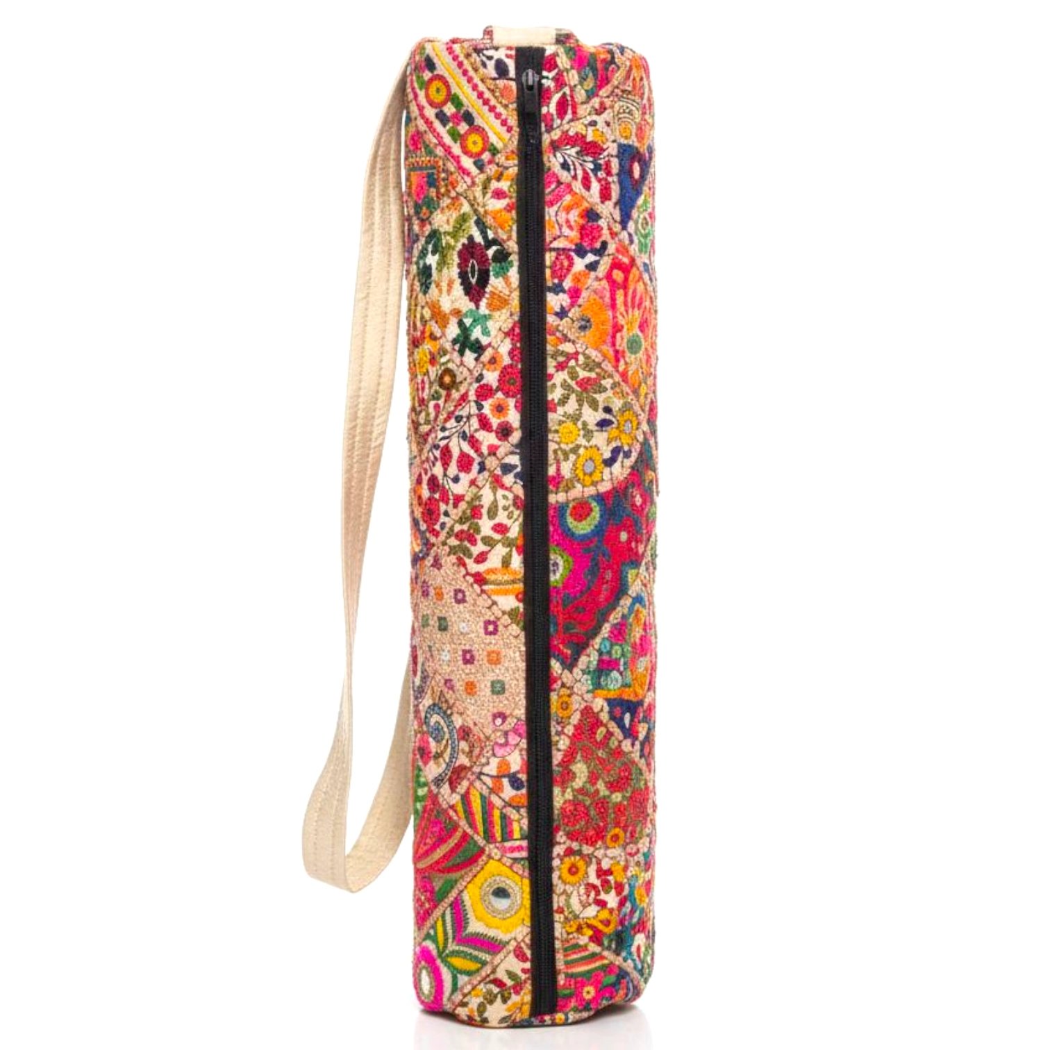 This beautiful yoga mat bag is made with an amazing embroidered fabric.