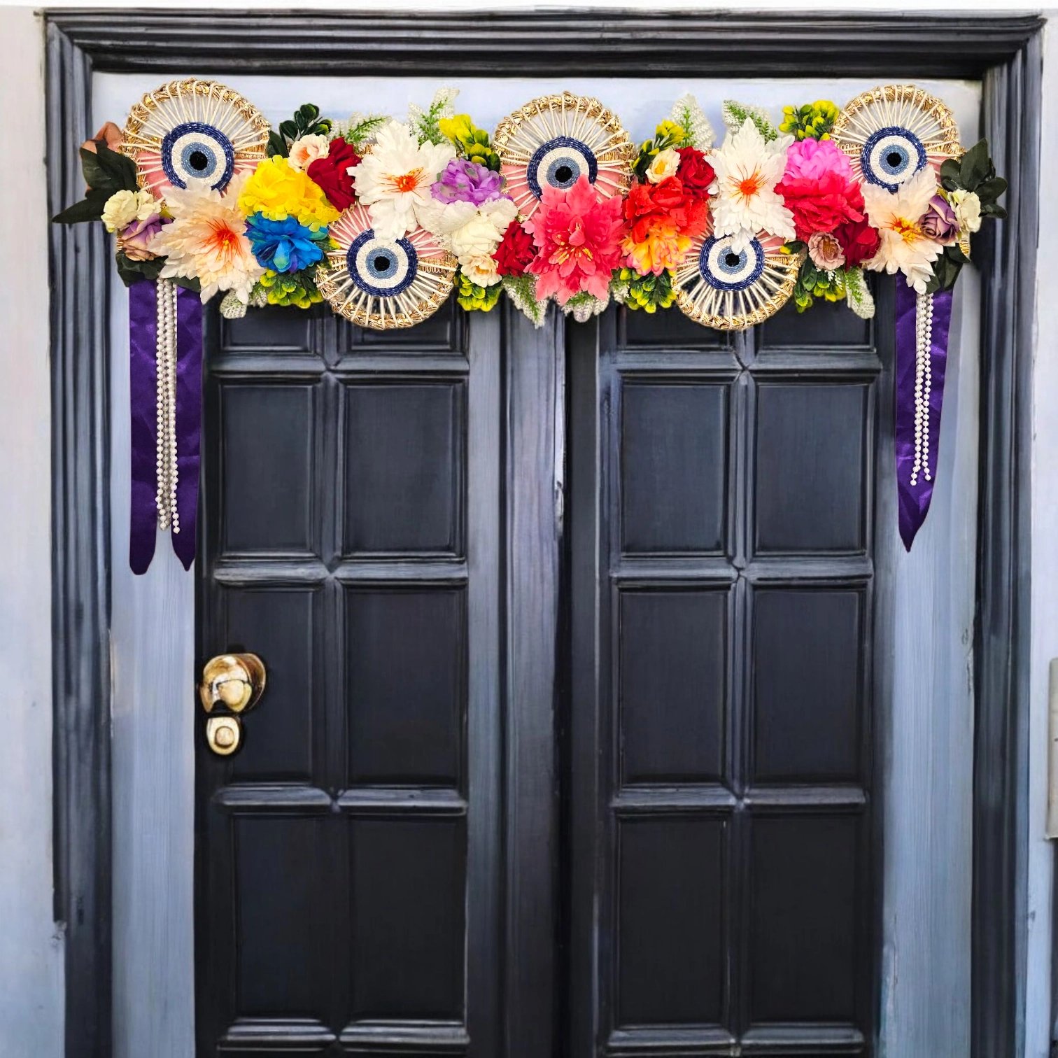 Get this exclusive evil eye toran with colorful flower work for your home décor this Diwali. A beautifully crafted toran adds to the festive ambiance, creating a warm and inviting atmosphere. We currently ship in Canada and the USA.