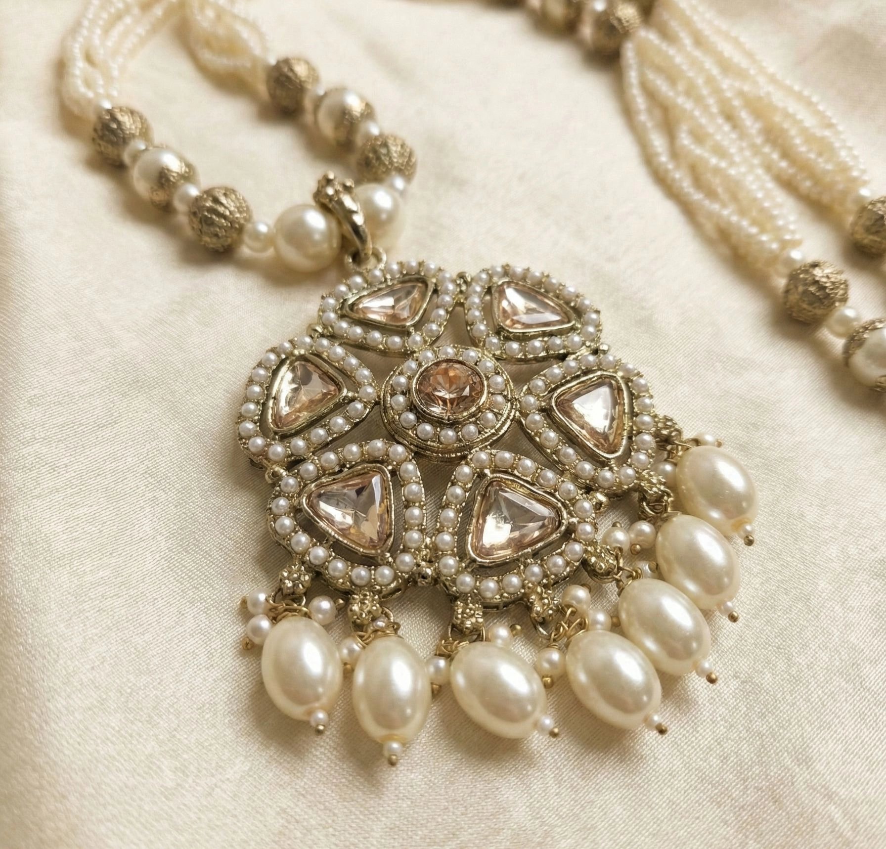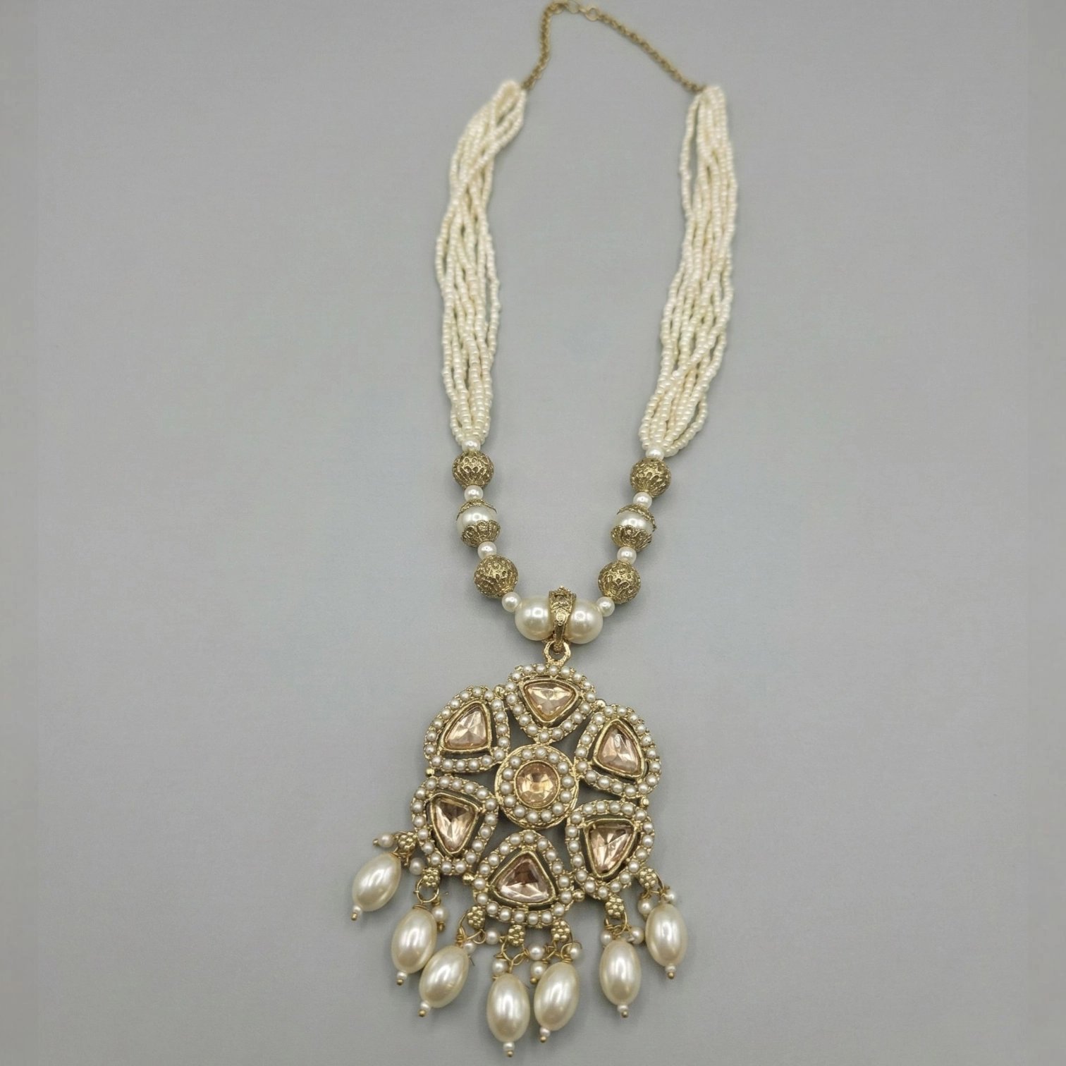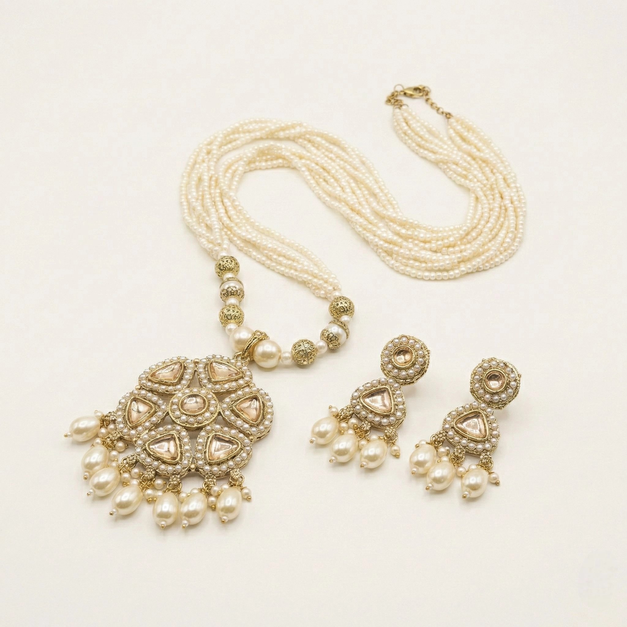 Celebrate the richness of Indian heritage with this Abha Golden Antique Necklace Set, beautifully crafted with Kundan stone pendant, paired with Rich cream colored pot and moti work. Inspired by traditional Indian aura, this set reflects timeless artistry and cultural elegance.