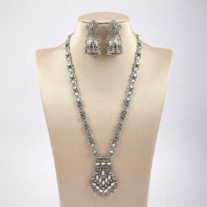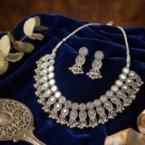Designed in a luxurious antique gold finish, the necklace showcases intricate detailing reminiscent of Kundan stones, making it a striking statement piece. The coordinated earrings enhance the regal look, making this set ideal for weddings, bridal wear, festive celebrations, pujas, and classical performances.