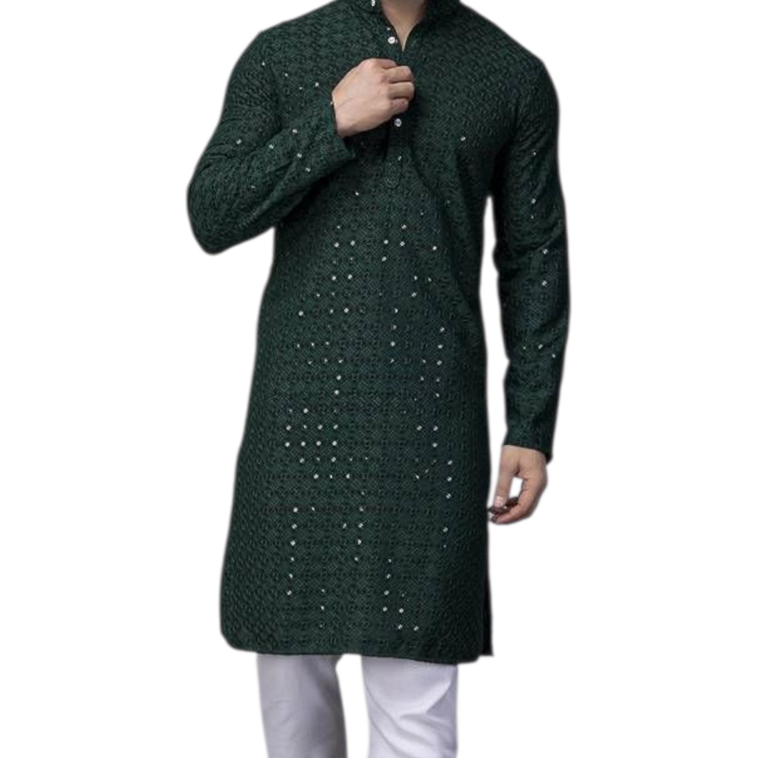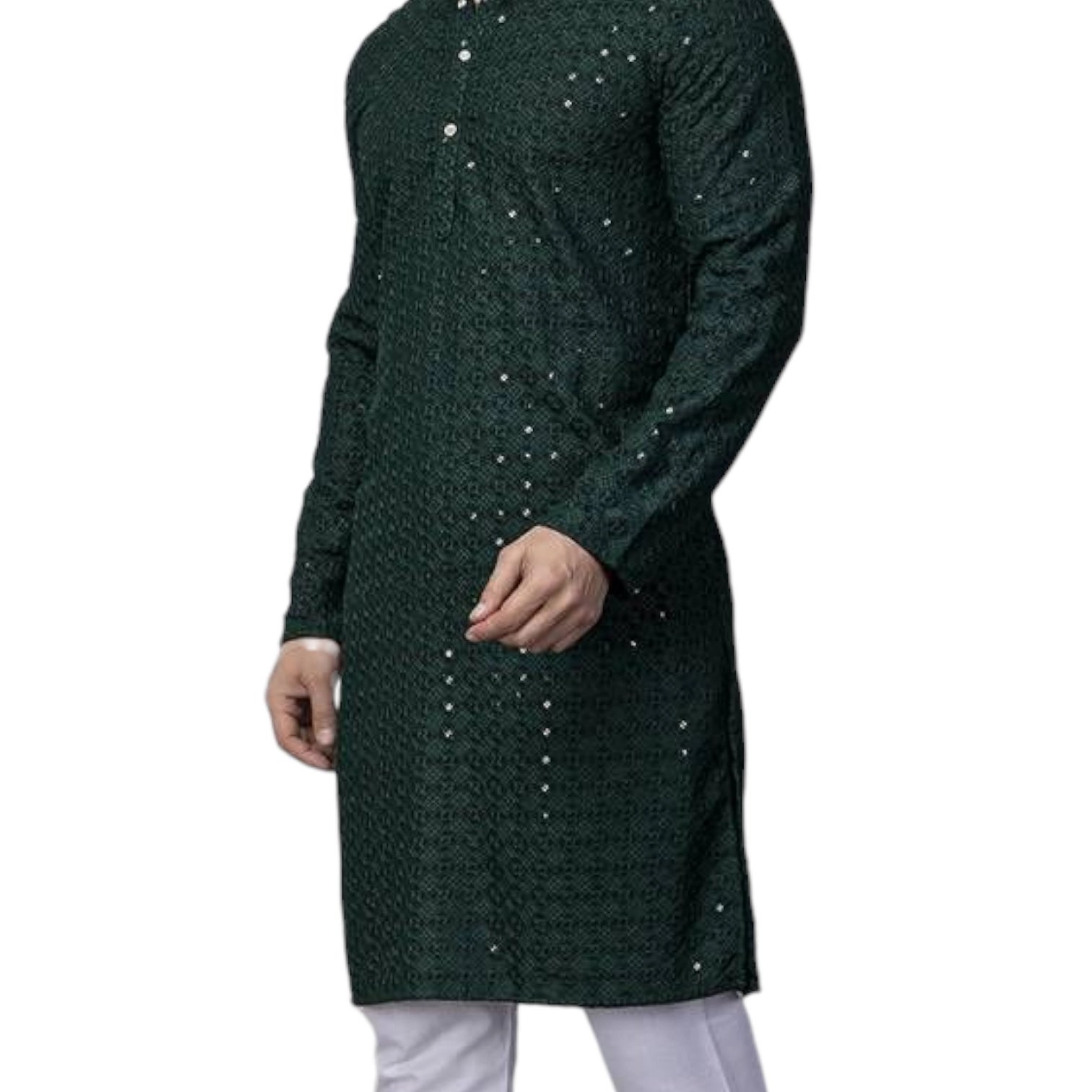 Elevate your traditional wardrobe with this elegant Men’s Kurta featuring exquisite sequin work. Designed with a refined Mandarin collar, this kurta combines timeless style with modern sophistication. The full sleeves and regular fit ensure a comfortable and polished look, making it perfect for festive occasions, weddings, or family gatherings.