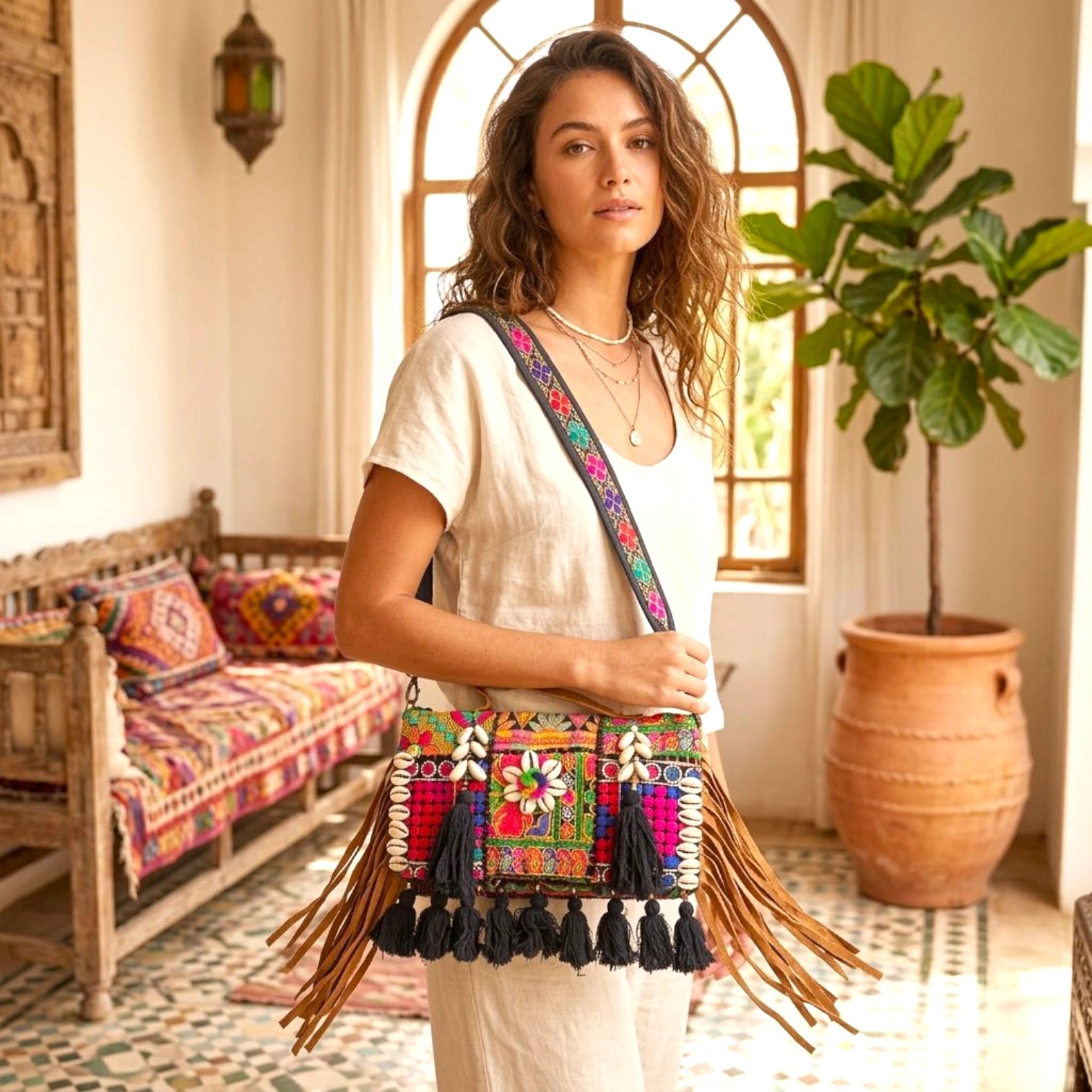 Elevate your style with this stunning handcrafted embroidered bag. The vintage tribal theme and boho style of the bag will surely make you stand out in any crowd. This bag is not just a fashion statement but also a work of art that represents the rich cultural heritage.