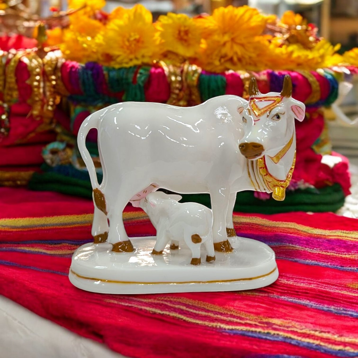 This sacred cow, revered in Hindu mythology as the symbol of abundance and fulfillment of wishes, is accompanied by a charming calf, embodying nurturing love and prosperity.