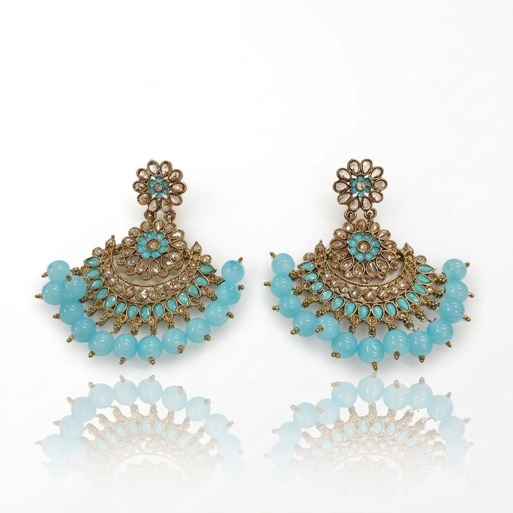 Add a touch of royal elegance to your ethnic look with these beautifully crafted Kundan Chand Earrings. Designed in a classic crescent (Chand) style, these earrings feature intricate Kundan stone setting paired with delicate Turquoise bead work that adds depth and richness to the design. The golden oxidized finish enhances the vintage charm, giving the earrings a timeless traditional appeal.