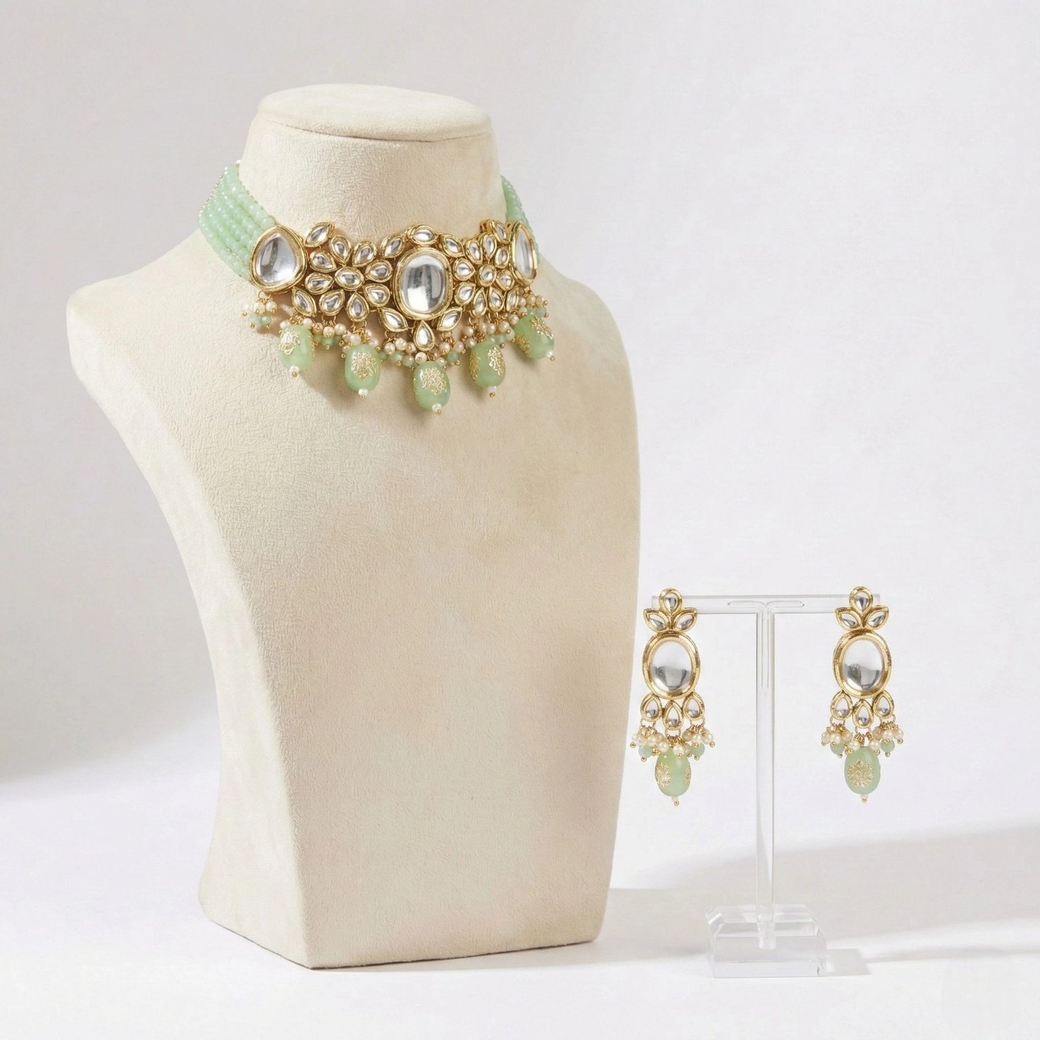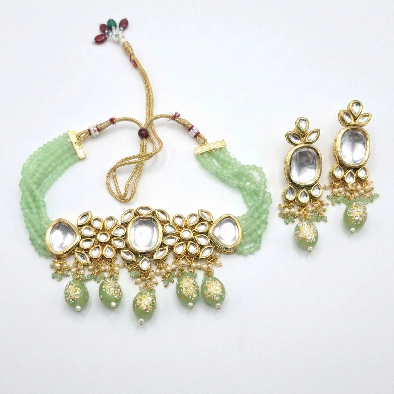 Elegant pastel pista green accents created with Crystals and Glass beads that complement both bridal and festive outfits