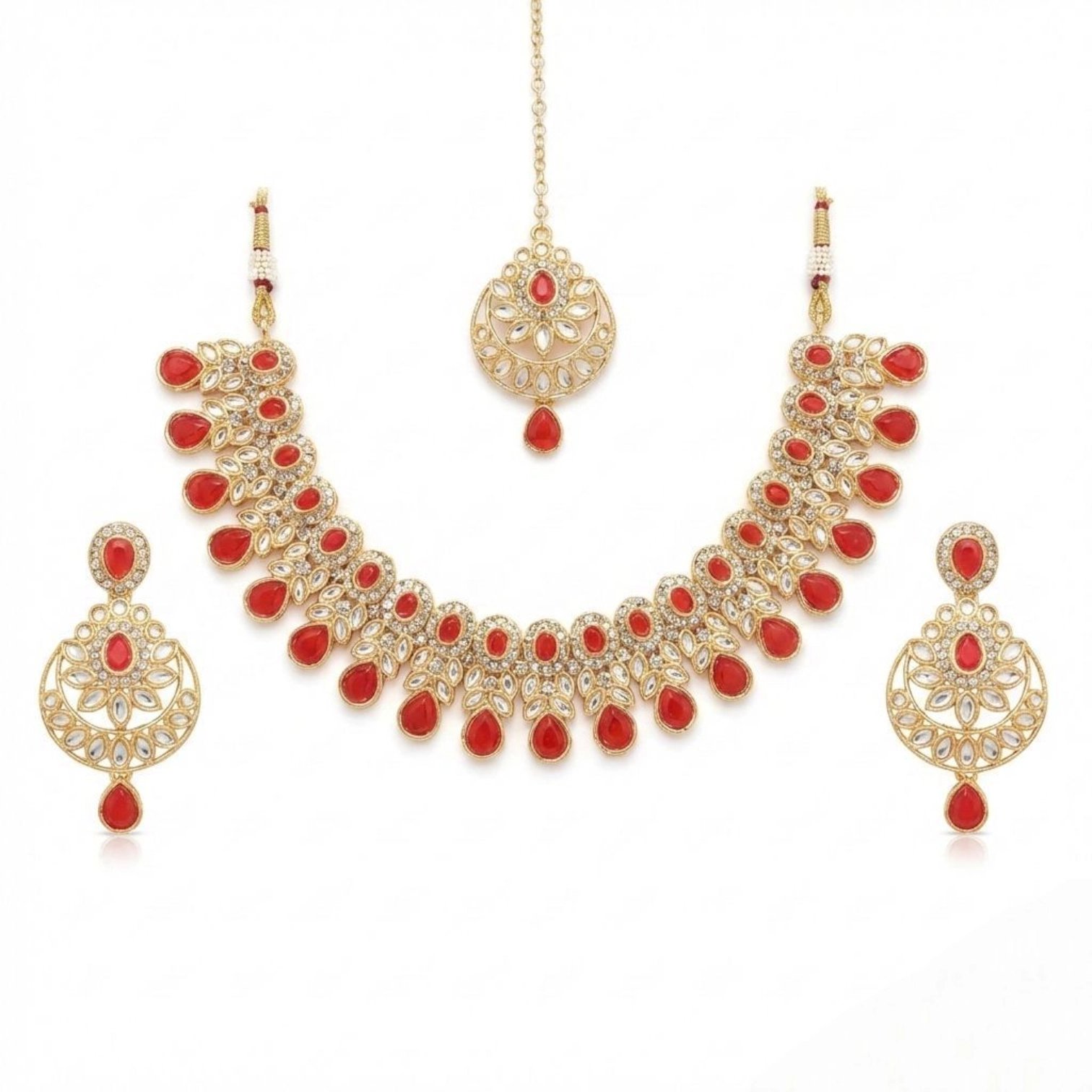 Kundan Necklace Set with Tikka – Red